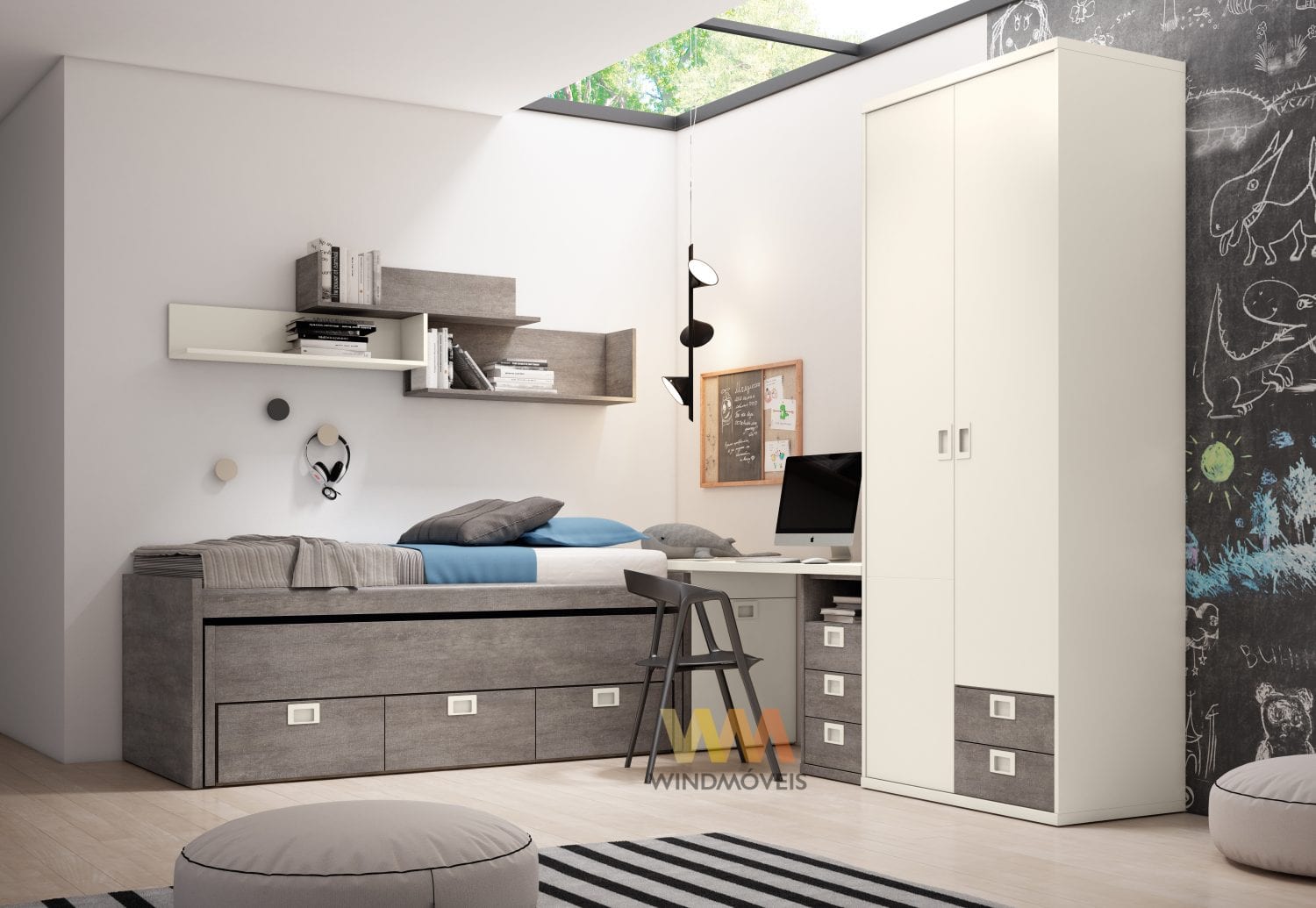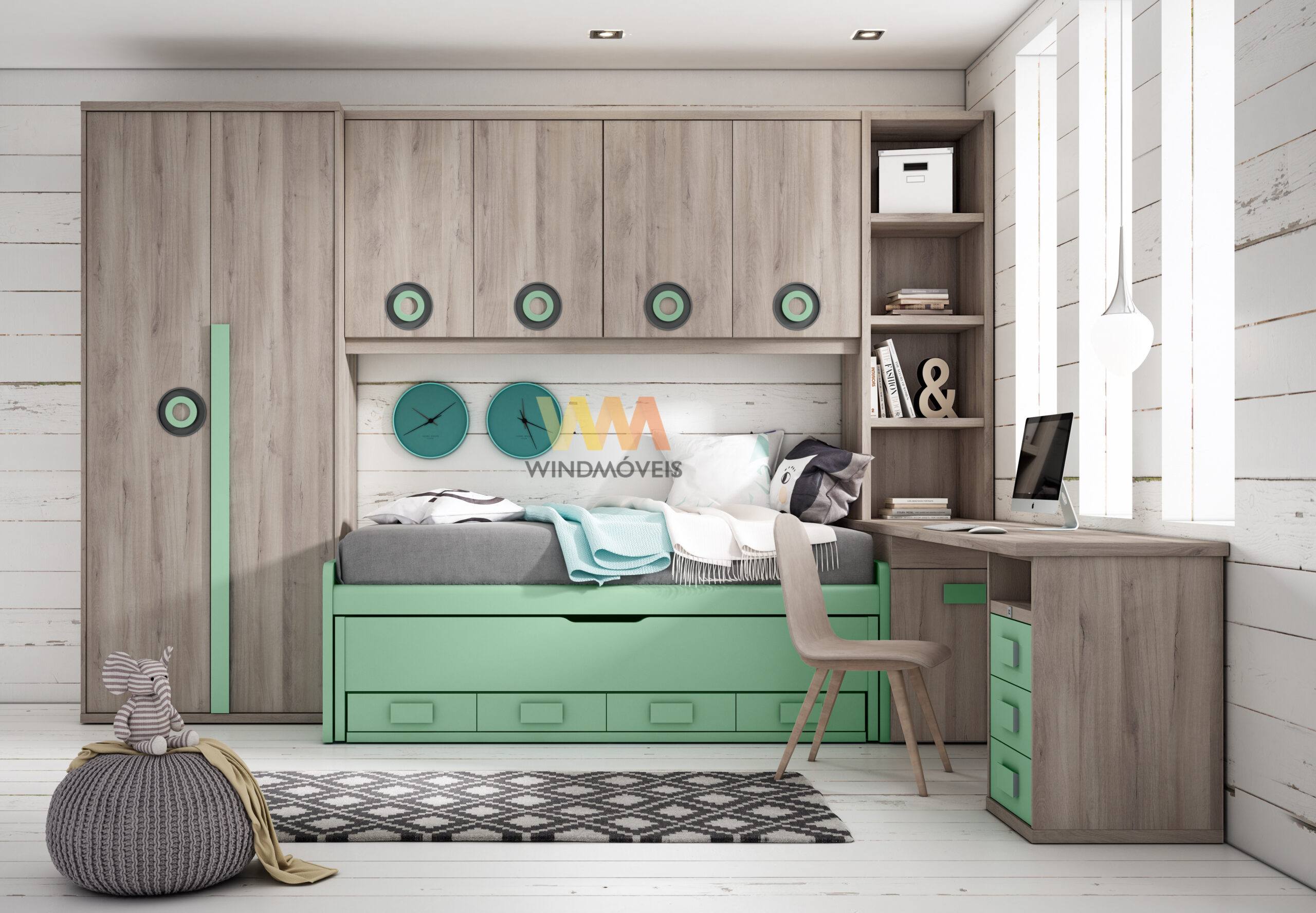 ...Proteção em madeira para cama superior; 1x Bloco com duas gavetas; 1x Secretária; 1x Modulo terminal com gavetão; Informação Complementar Estrado incluido 1900×900; Para tomar conhecimento das melhores opções para...