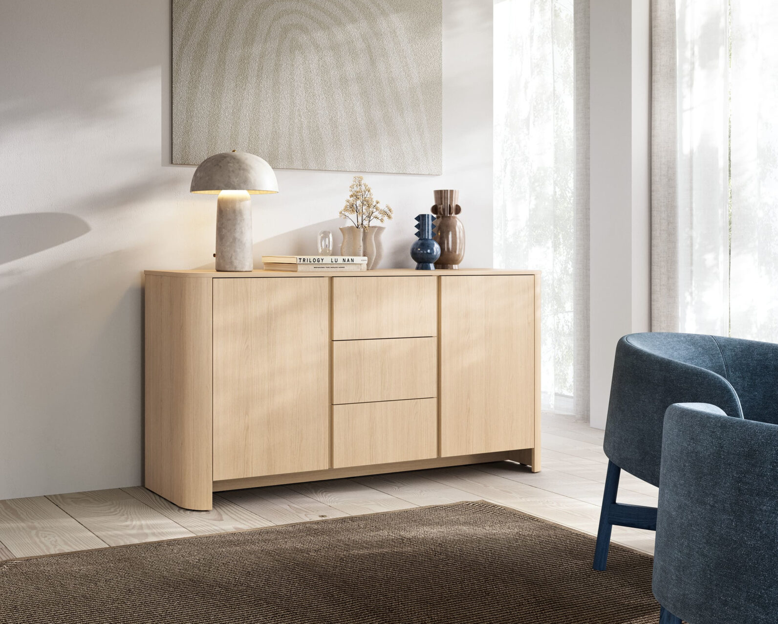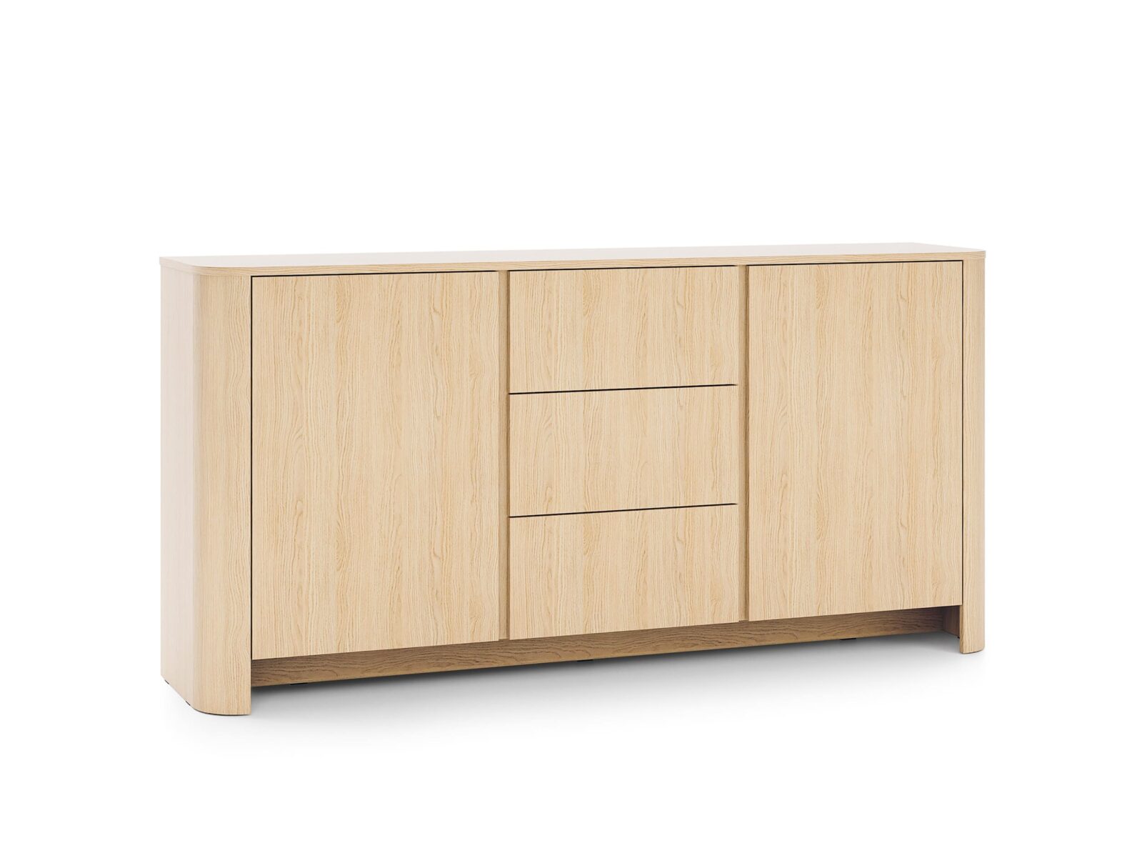 Aparador Bari com duas portas e três gavetas.