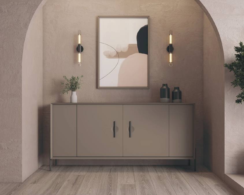Aparador Klassic Franco Furniture com quatro portas em Lacado Mate com pés metálicos.