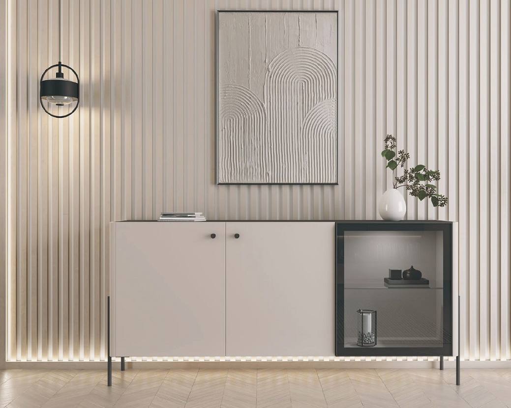 Aparador Nala com duas portas em madeira e uma porta de vidro em Lacado Mate com pés metálicos.