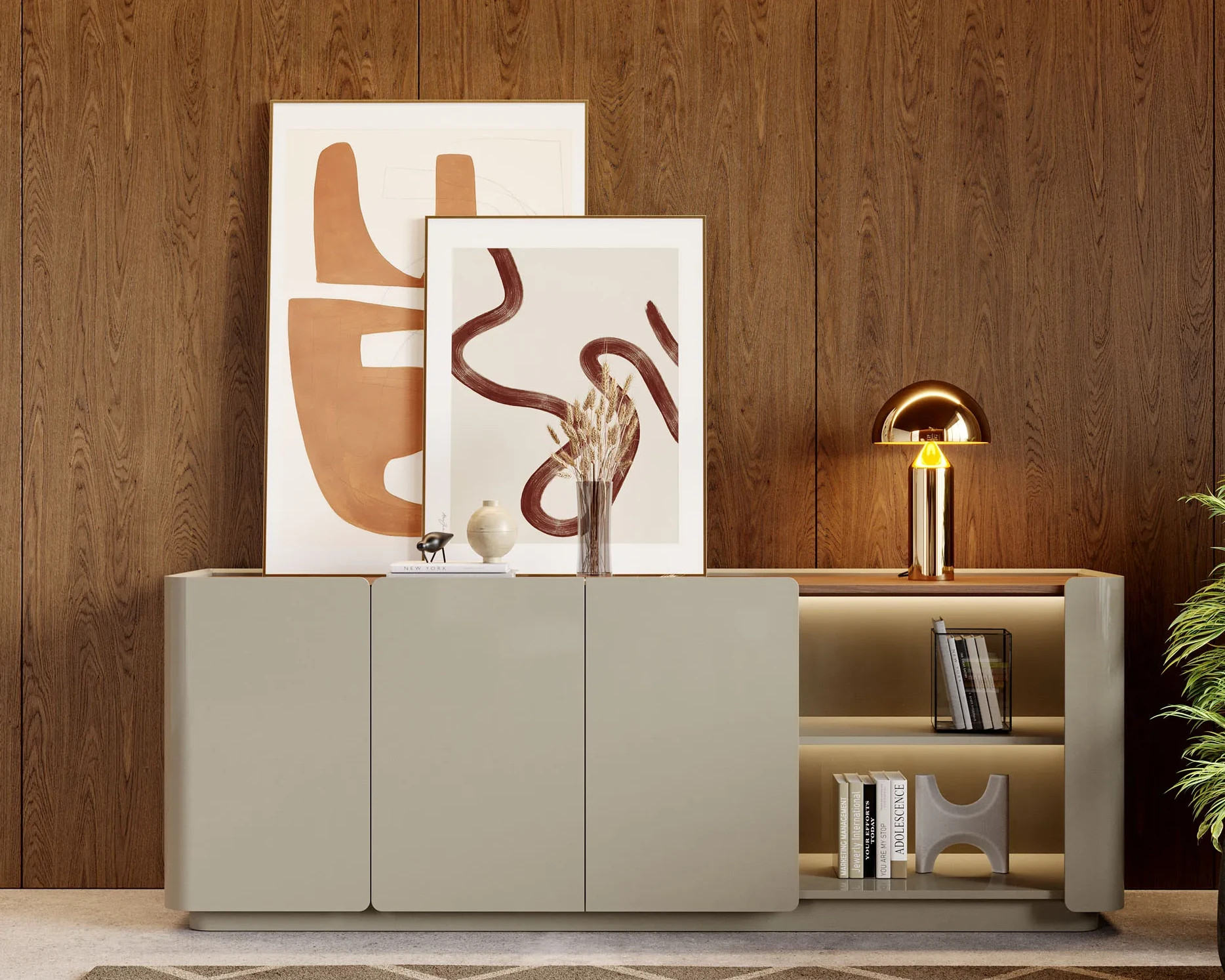 Aparador Soho com três portas prateleiras internas e faqueiro estrutura em Lacado.