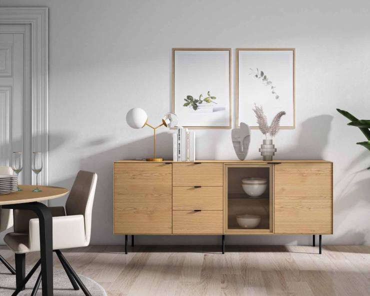 A sua estrutura é feita de folheado de carvalho, enquanto as frentes de carvalho maciço com ranhuras proporcionam textura e um acabamento natural que emana elegância.