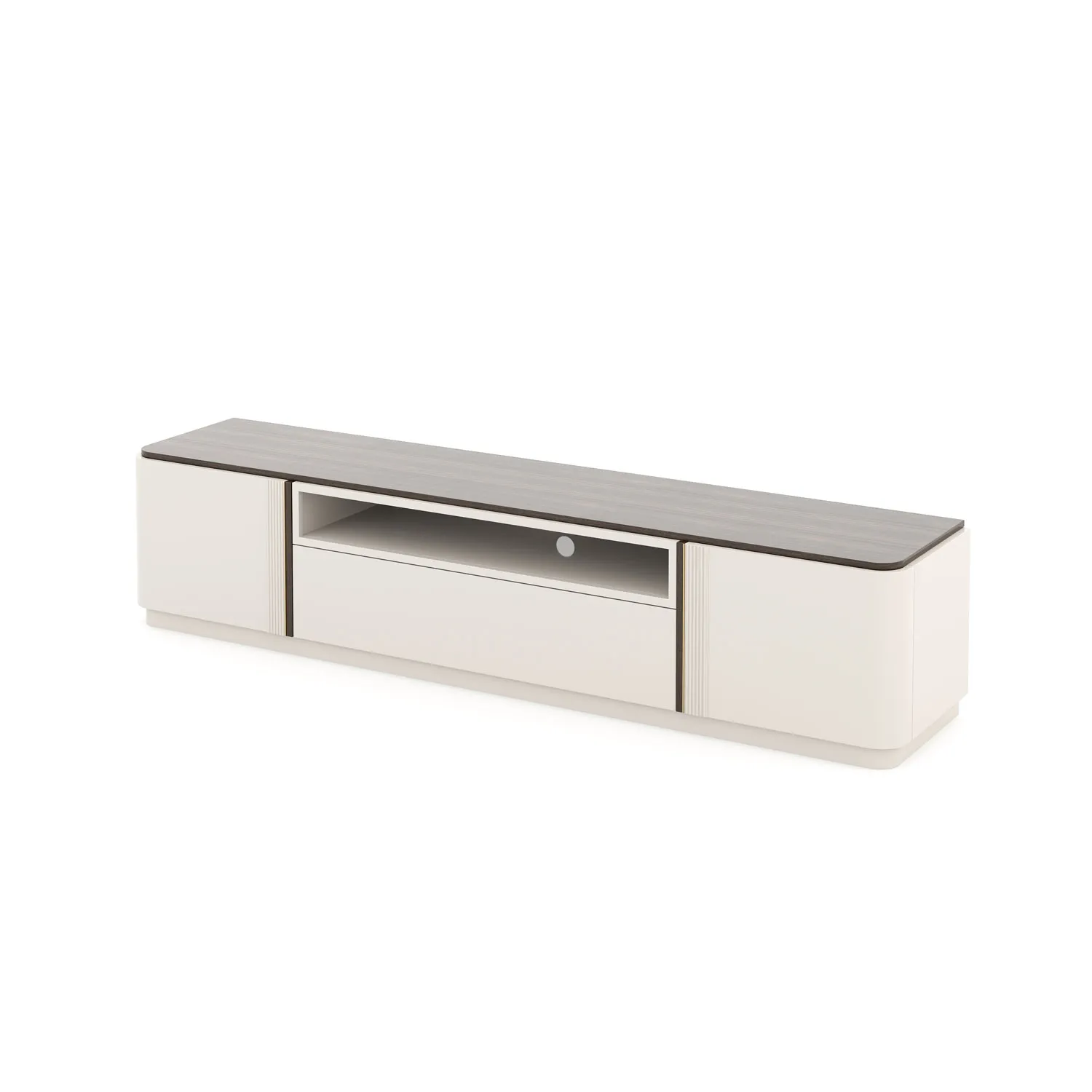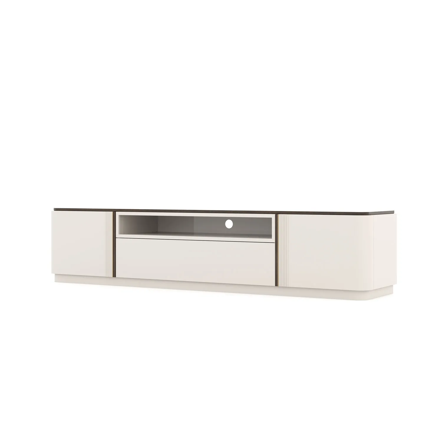 Base Tv Daris com abertura com duas portas e gaveta em Lacado e Nogueira.