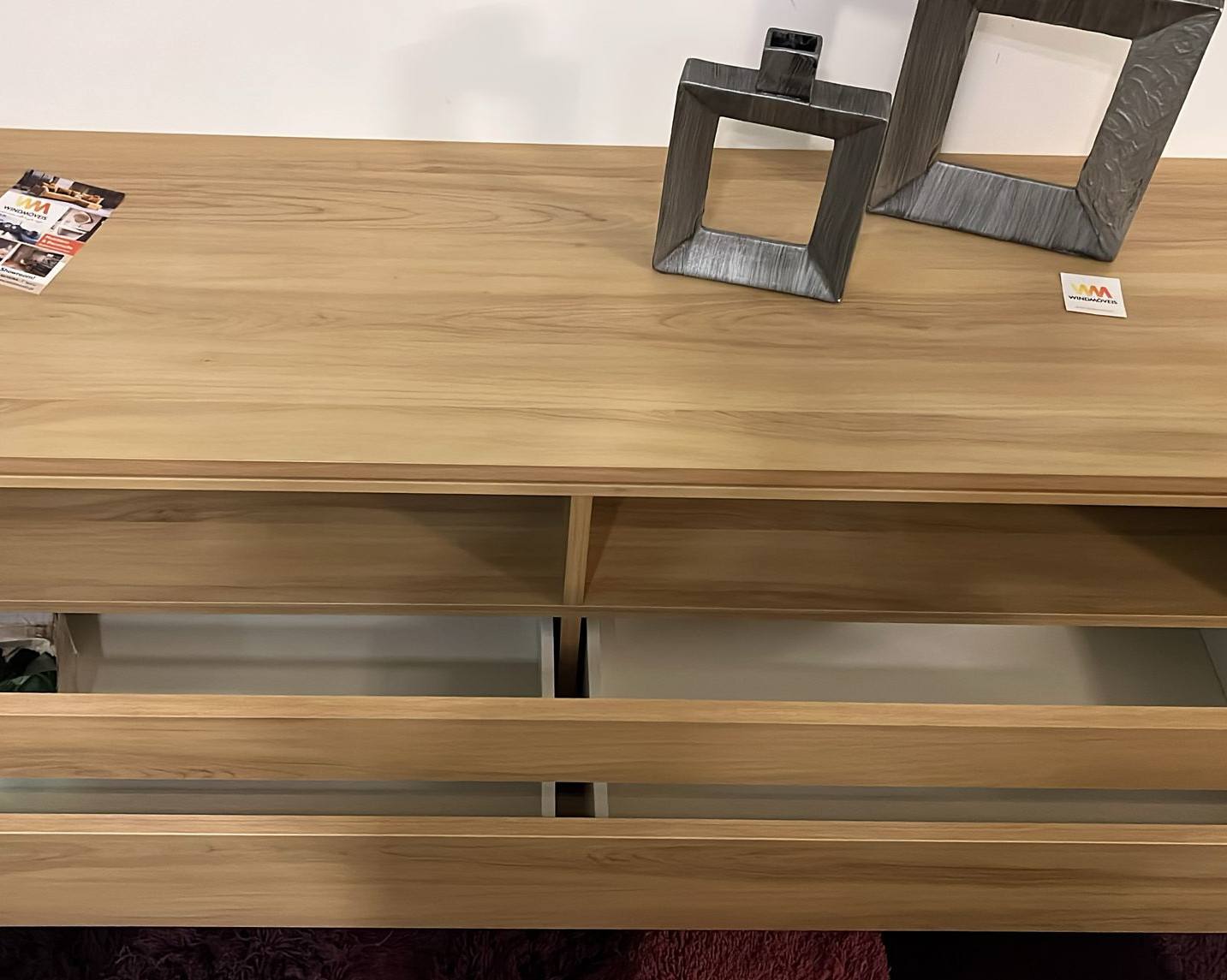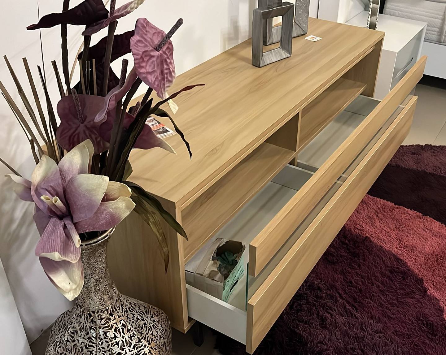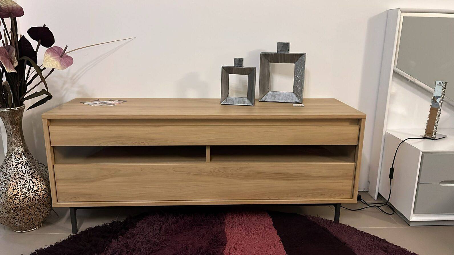 Base Tv Duo 521586M em melamina com uma gaveta com pormenor em vidro.