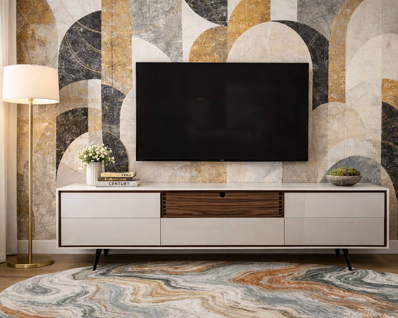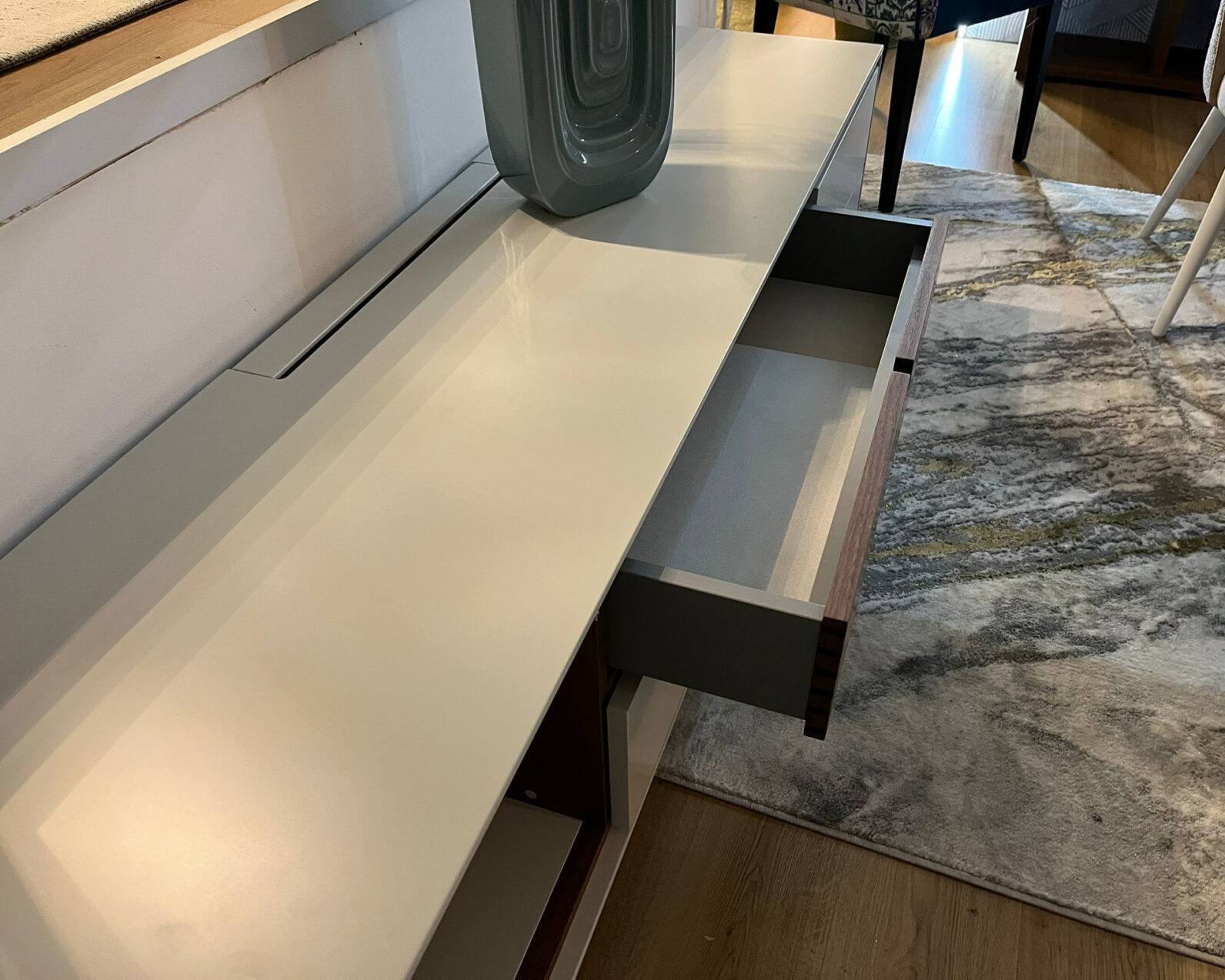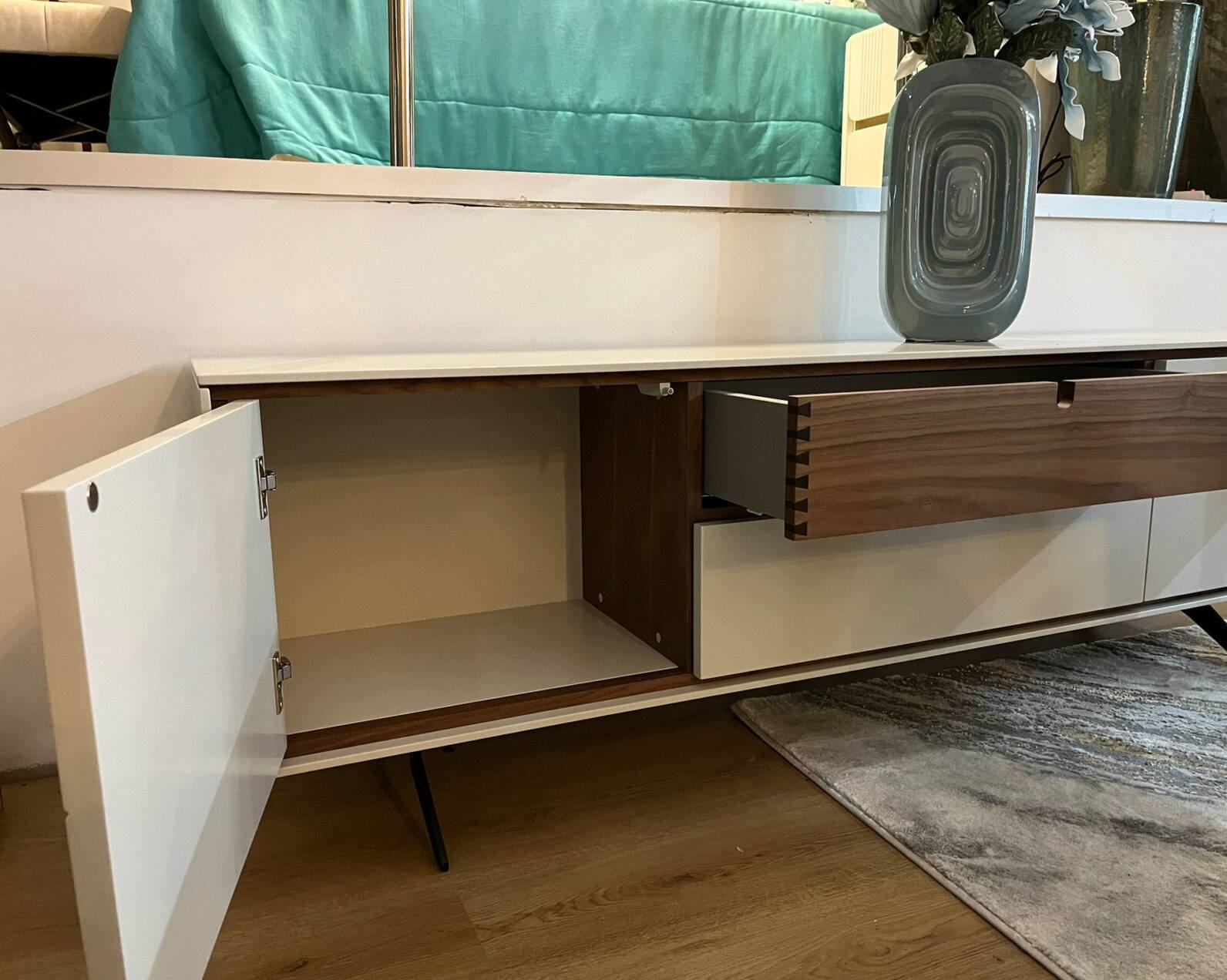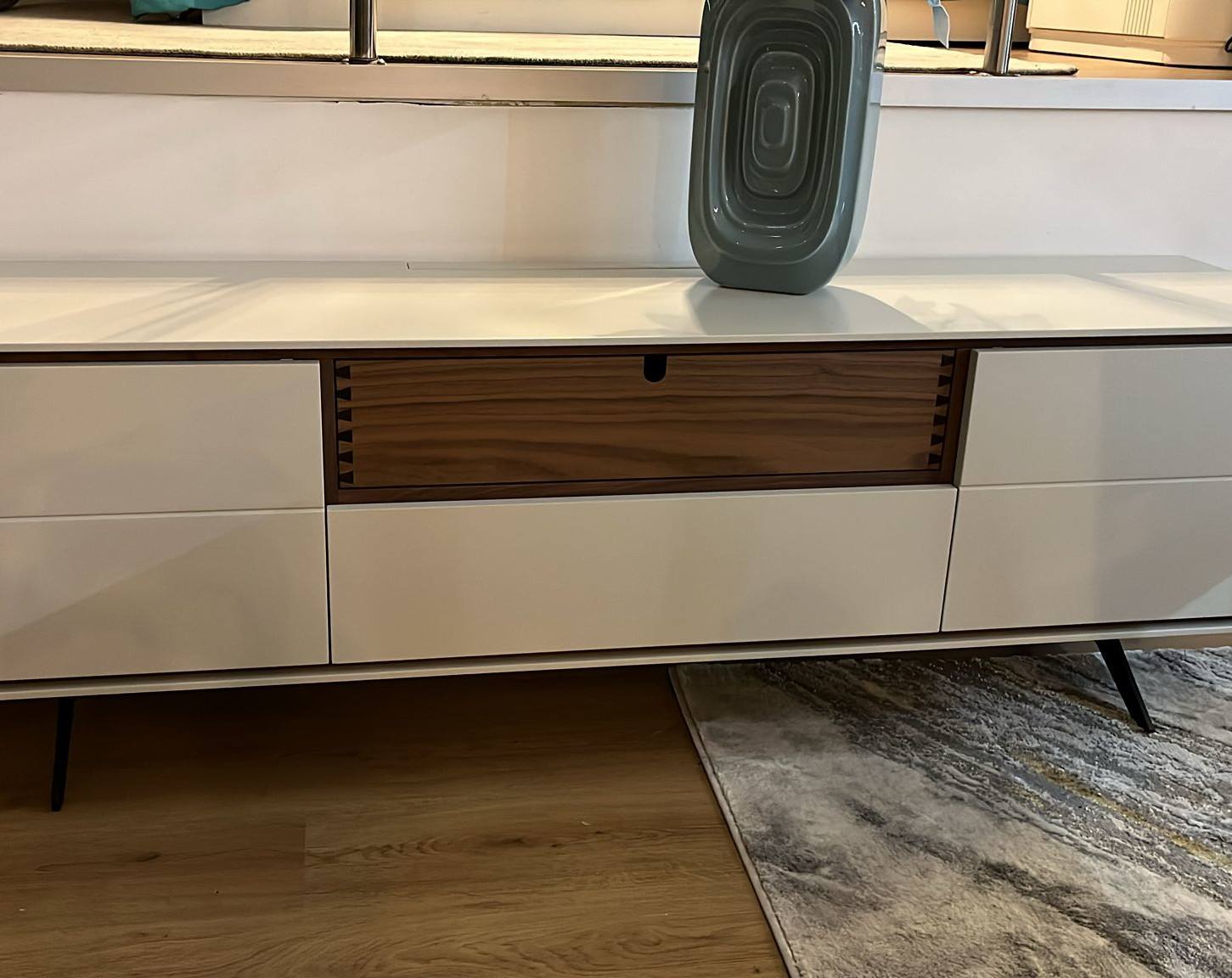Base Tv EEVE com duas portas e duas gavetas em Lacado Mate com pormenores em Nogueira, pés metálicos.