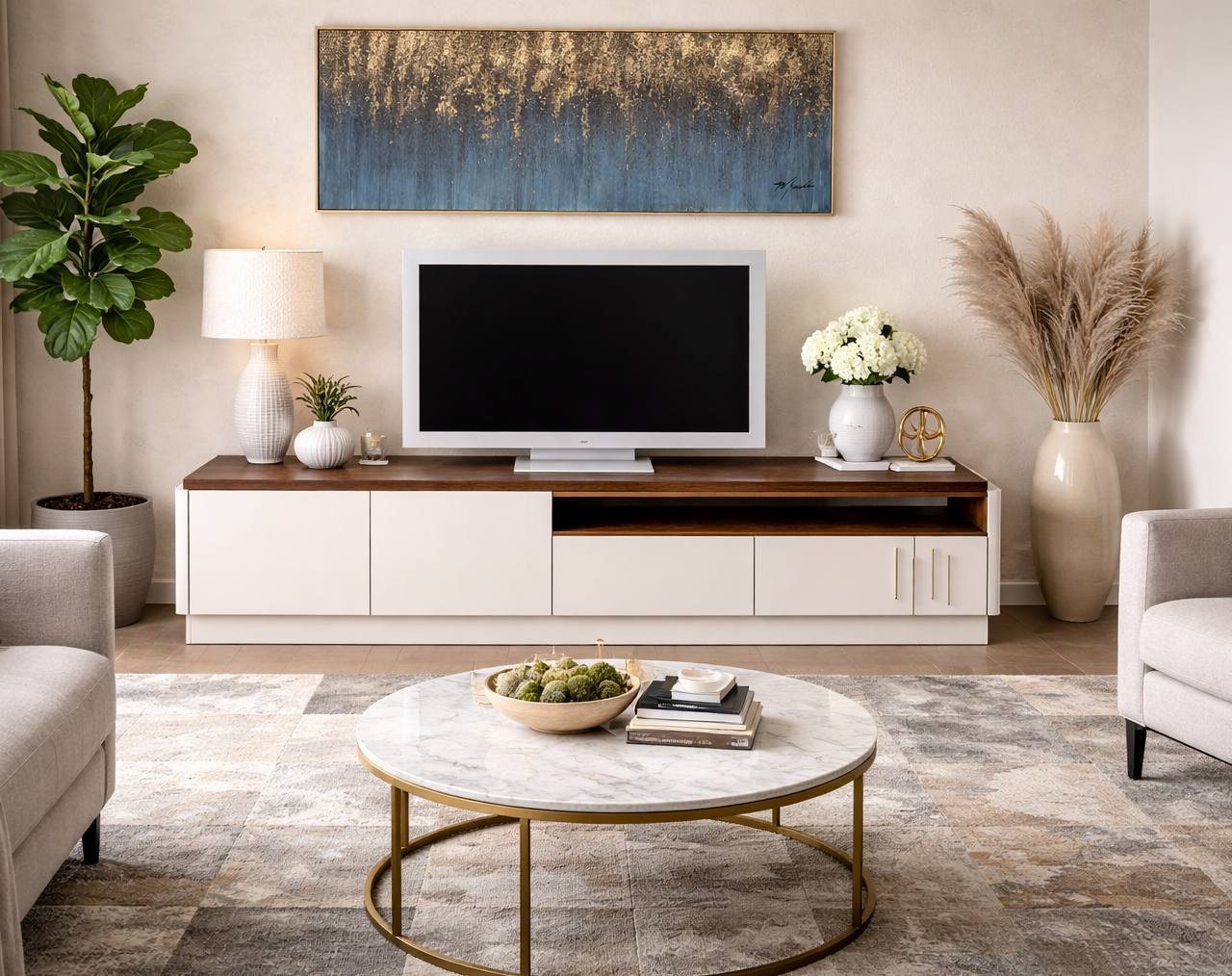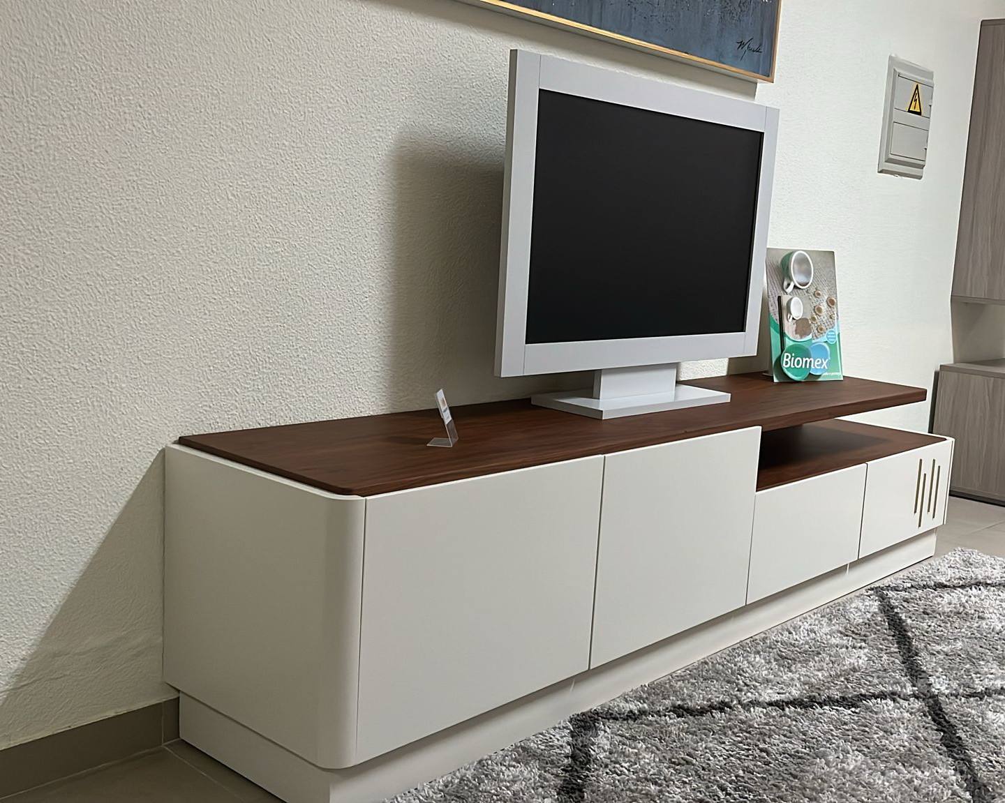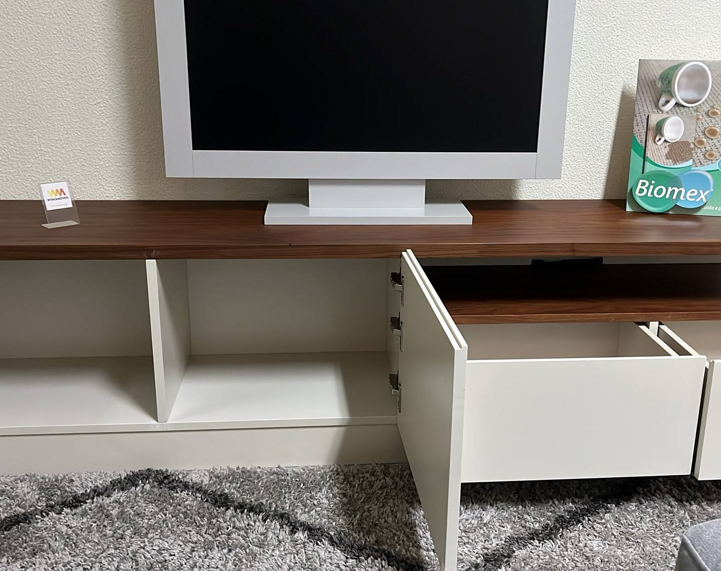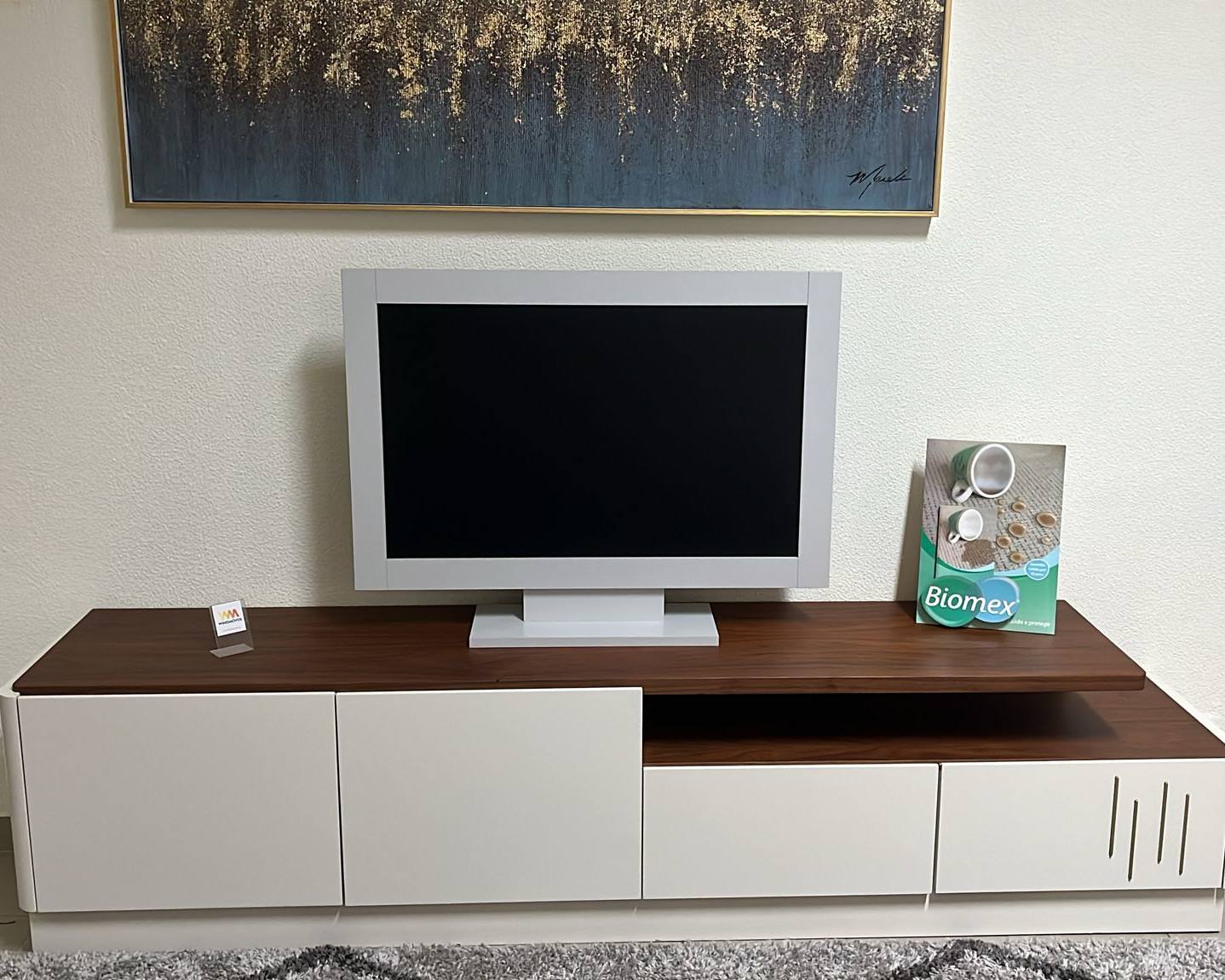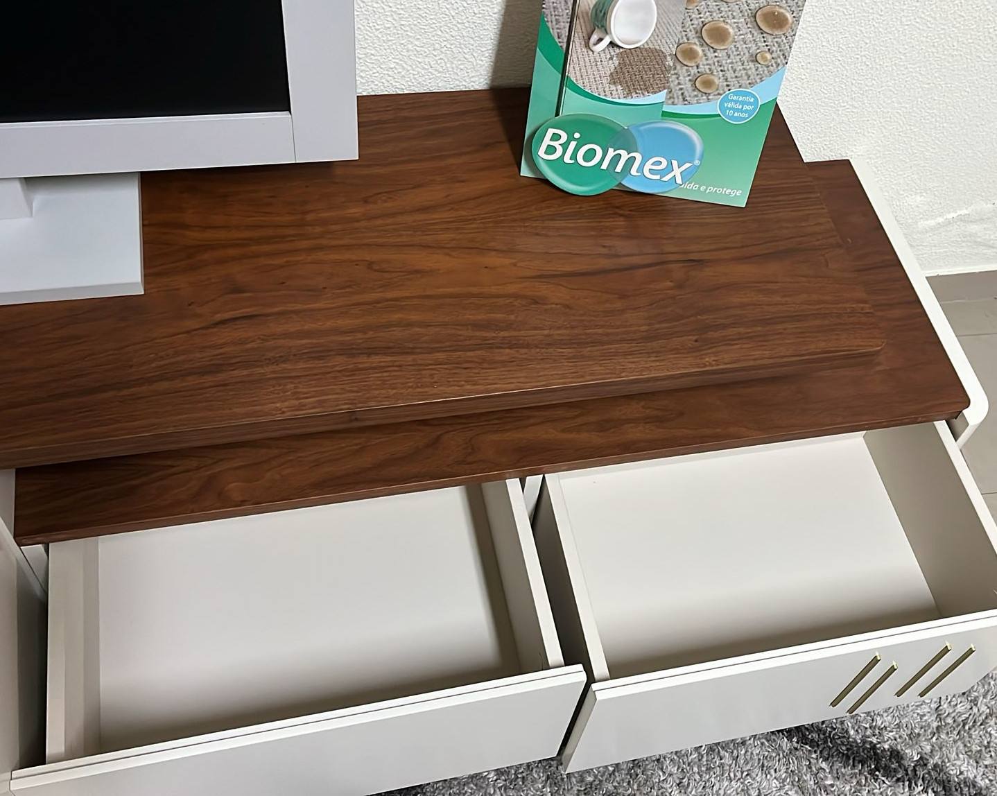 Base Tv Mary em lacado mate com tampo em nogueira.