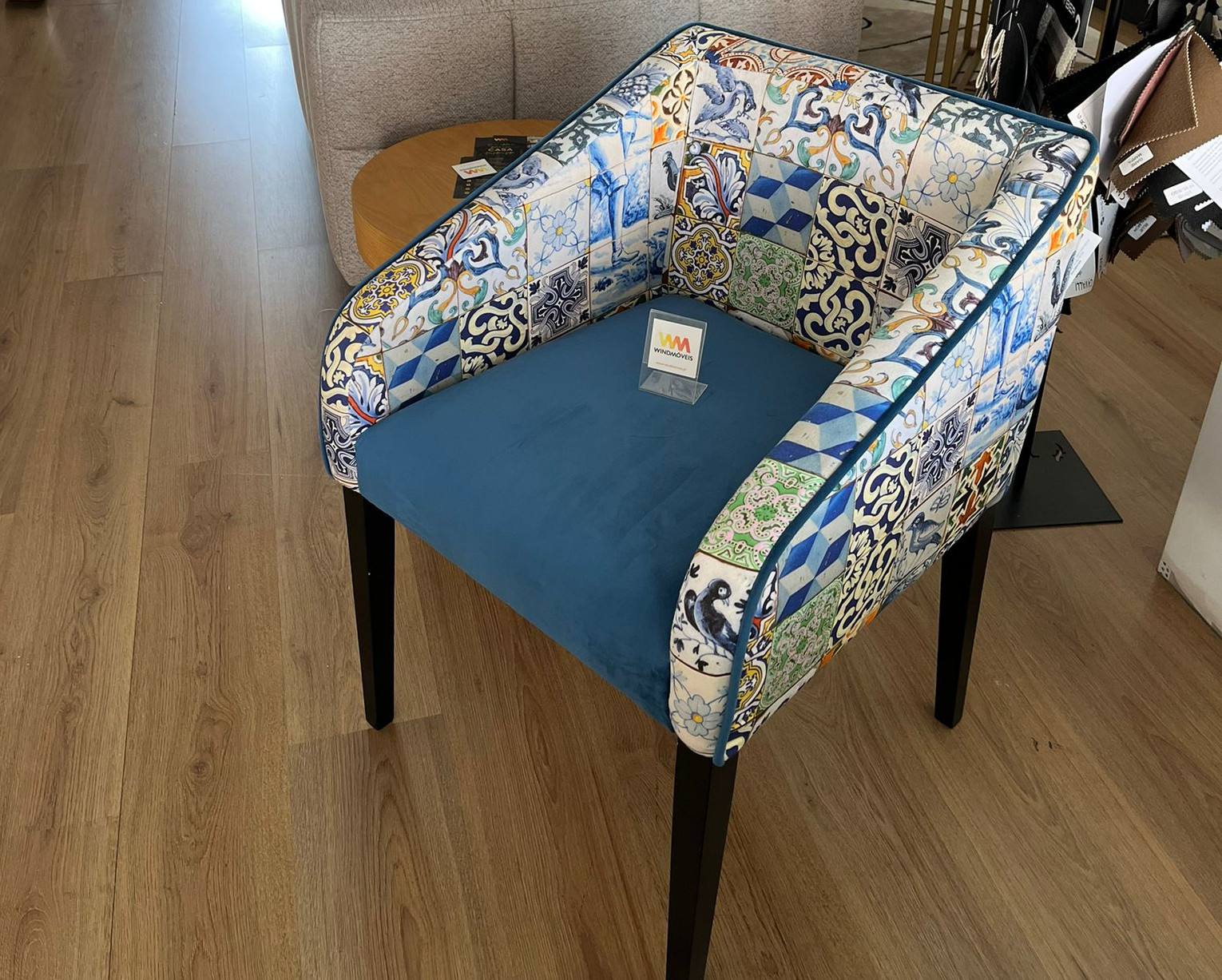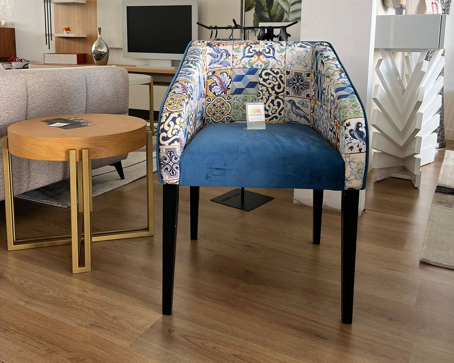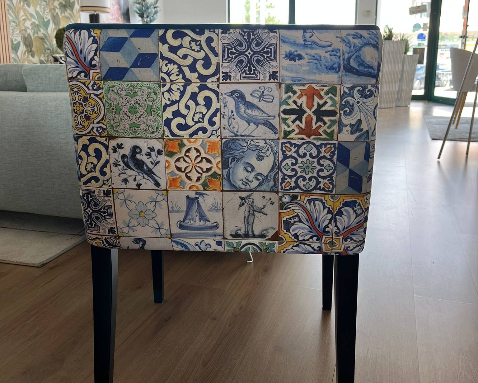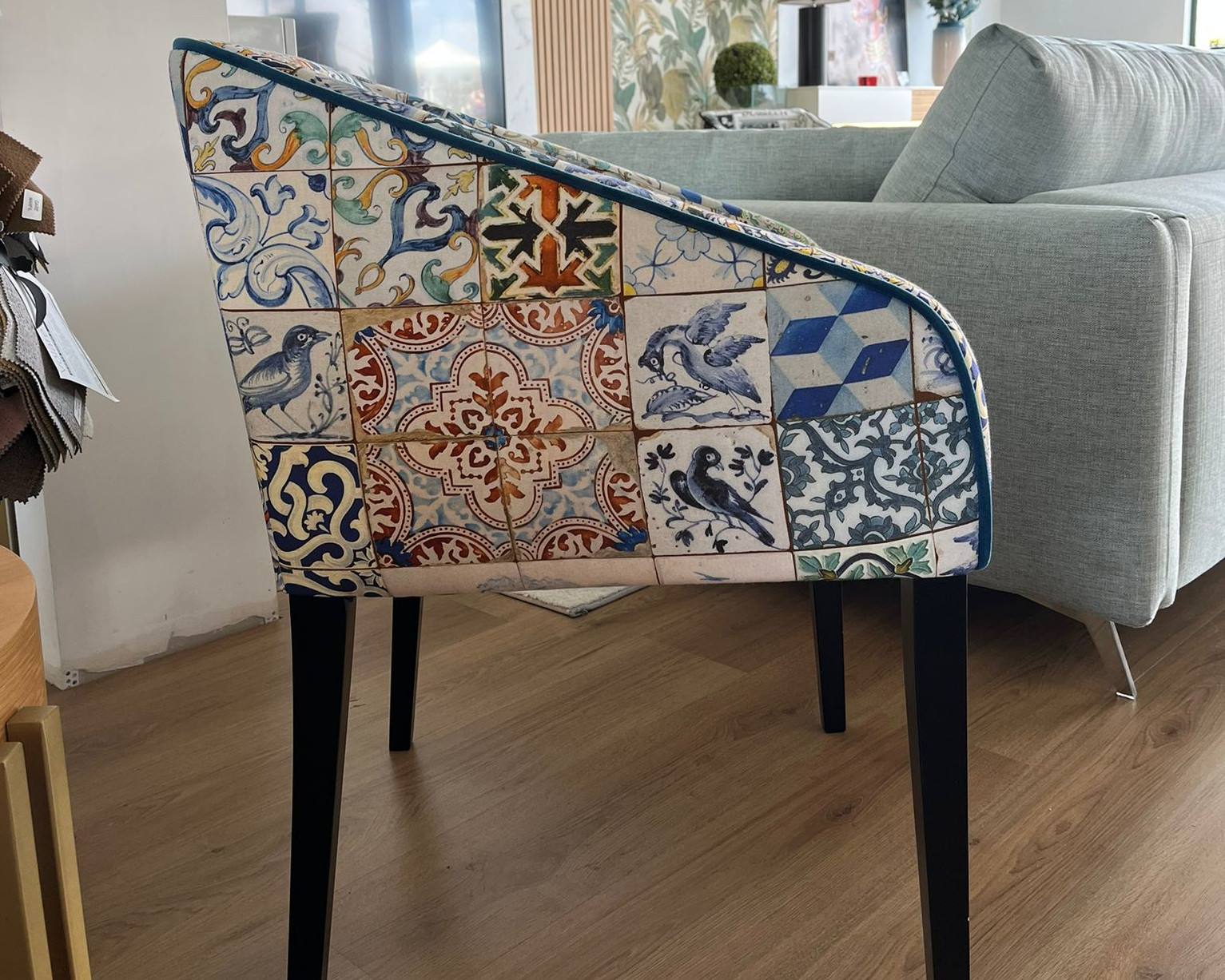 Cadeirão Azulejos em tecido com pés em madeira pintados a Lacado Preto.