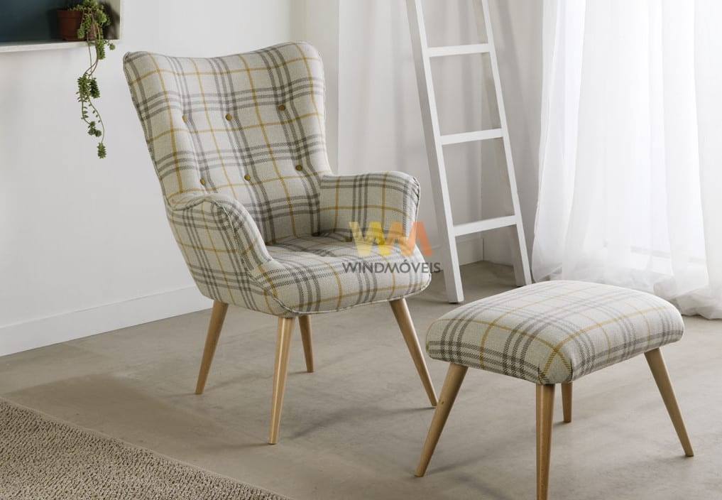 Cadeirão Nordico com revestimento em tecido em pés em madeira.