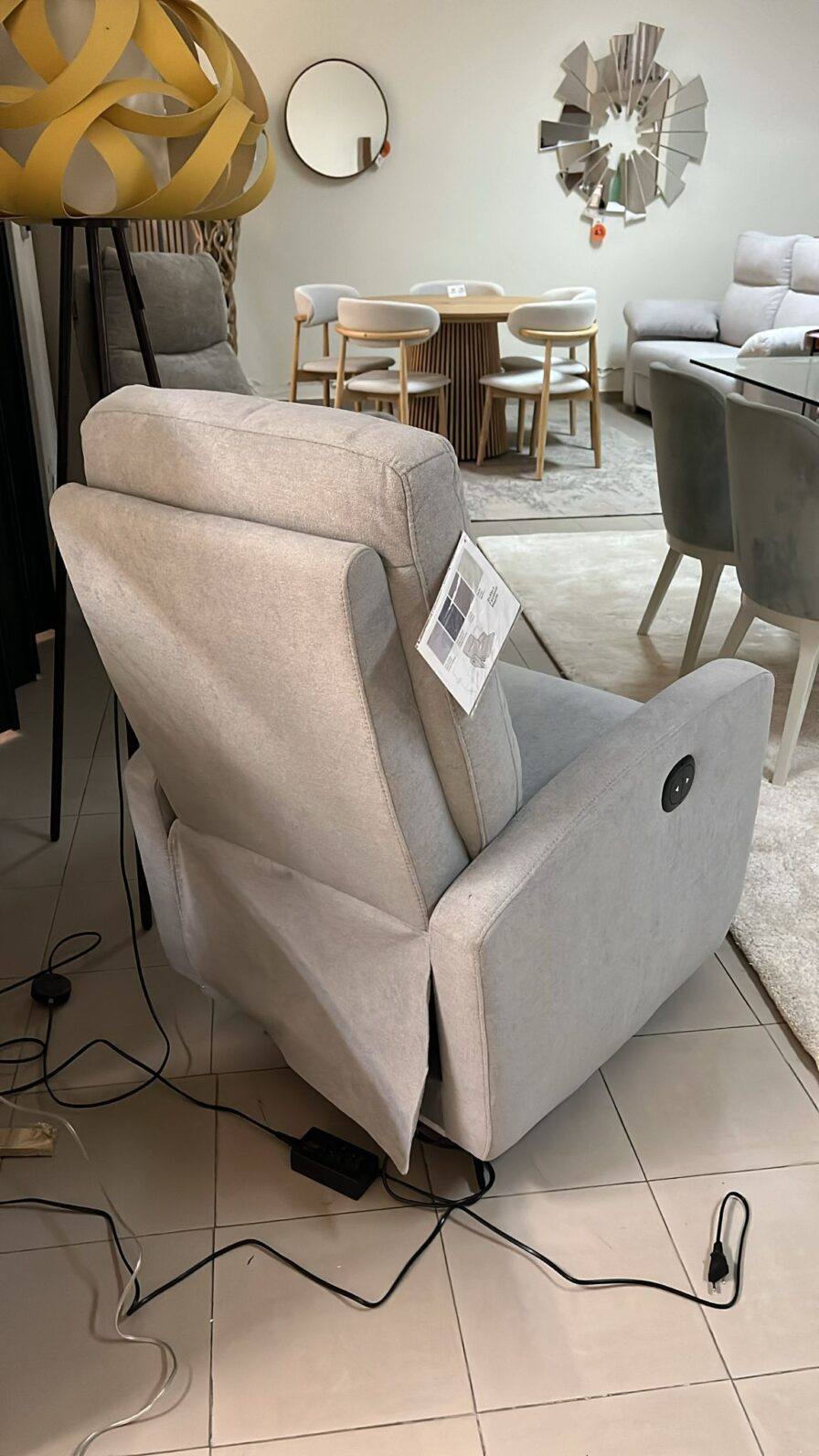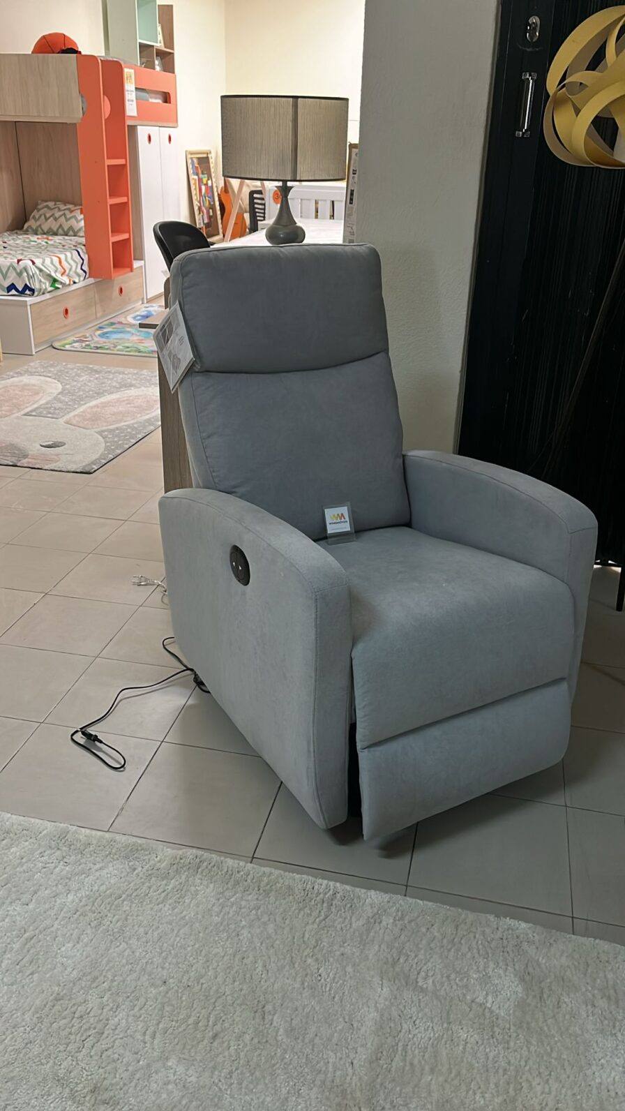 Cadeirão Almeria com revestimento em tecido cinza com sistema relax elétrico com um motor.