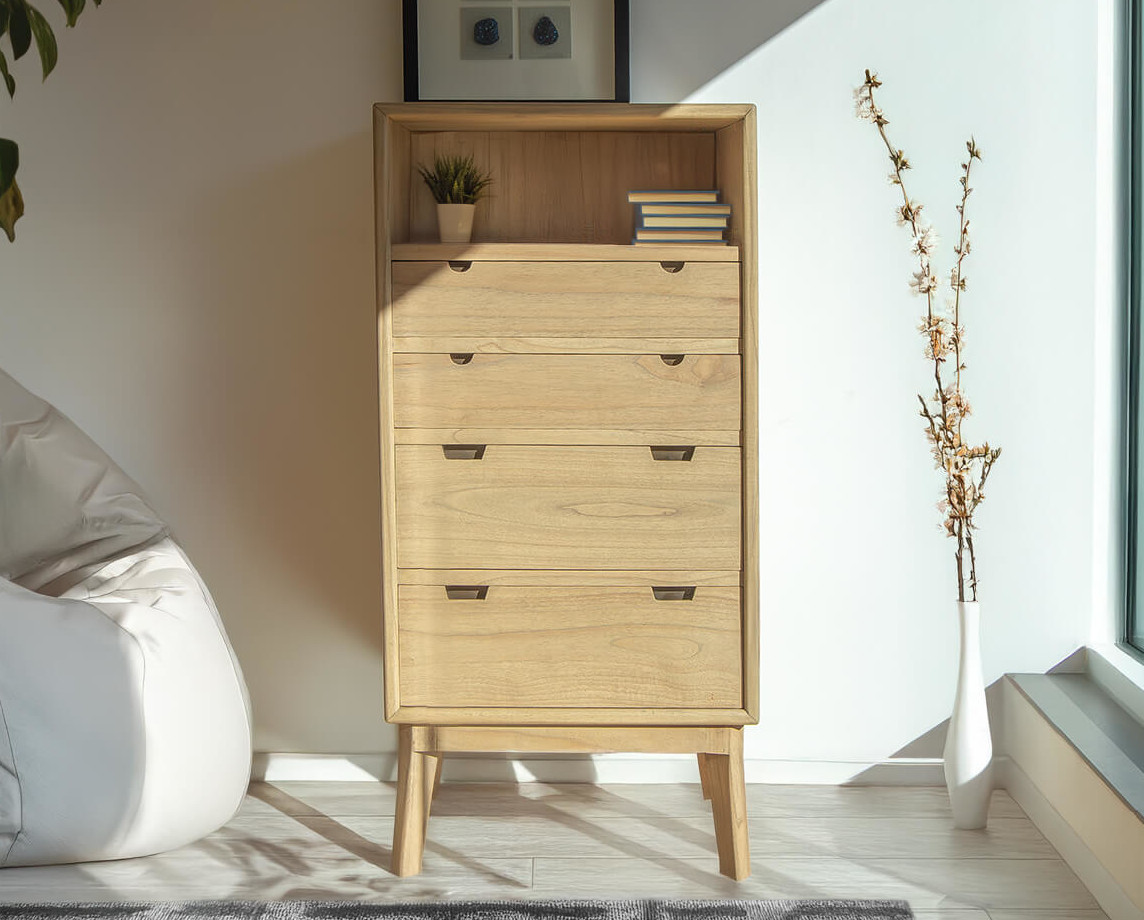 Camiseiro Scandi com quatro gavetas em madeira maciça.