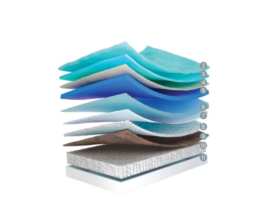 9 Coco – Fibra compacta termoligada com látex, muito resistente, ao mesmo tempo elástica. Oferece uma adaptação progressiva.
