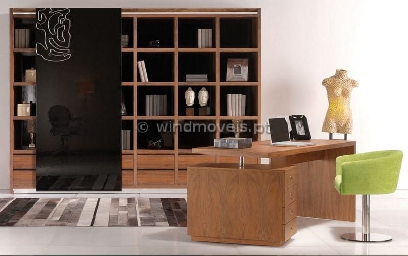 - Estante composta por oito gavetas com vãos abertos de prateleira uma porta de correr em Lacado