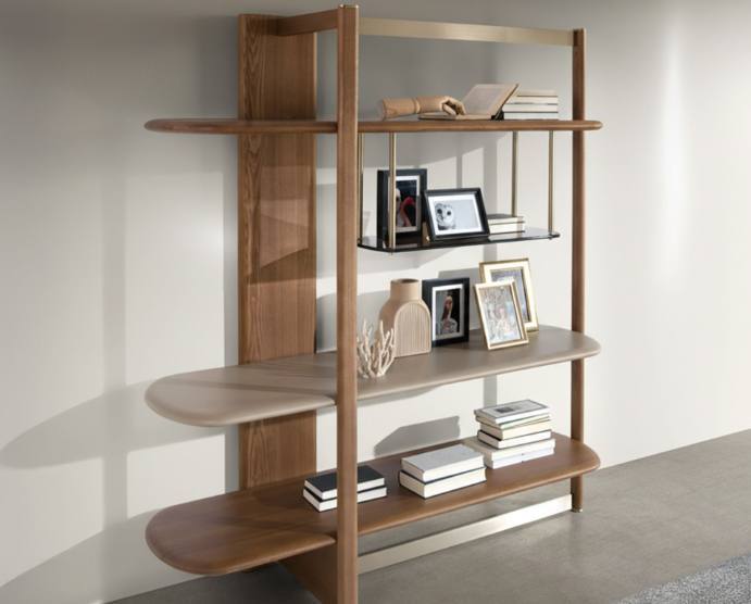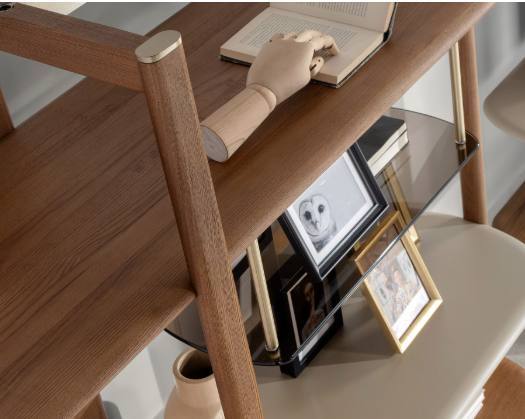 Estante 3300 com estrutura e prateleiras em madeira cor nogueira clara, combinadas com prateleiras em MDF lacado cor greige e em vidro fumé castanho.