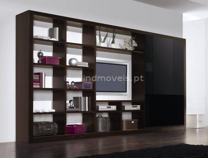 Estante em madeira de carvalho com porta de correr com frente de vidro lacado preto e escada metálica
