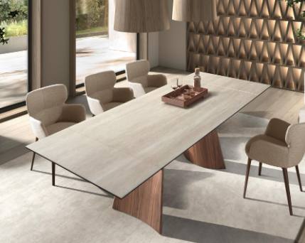 Mesa 1164 extensível retangular de design moderno com tampo de mármore porcelânico cor de areia em acabamento mate.