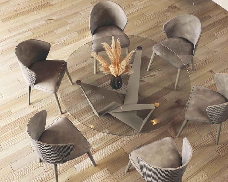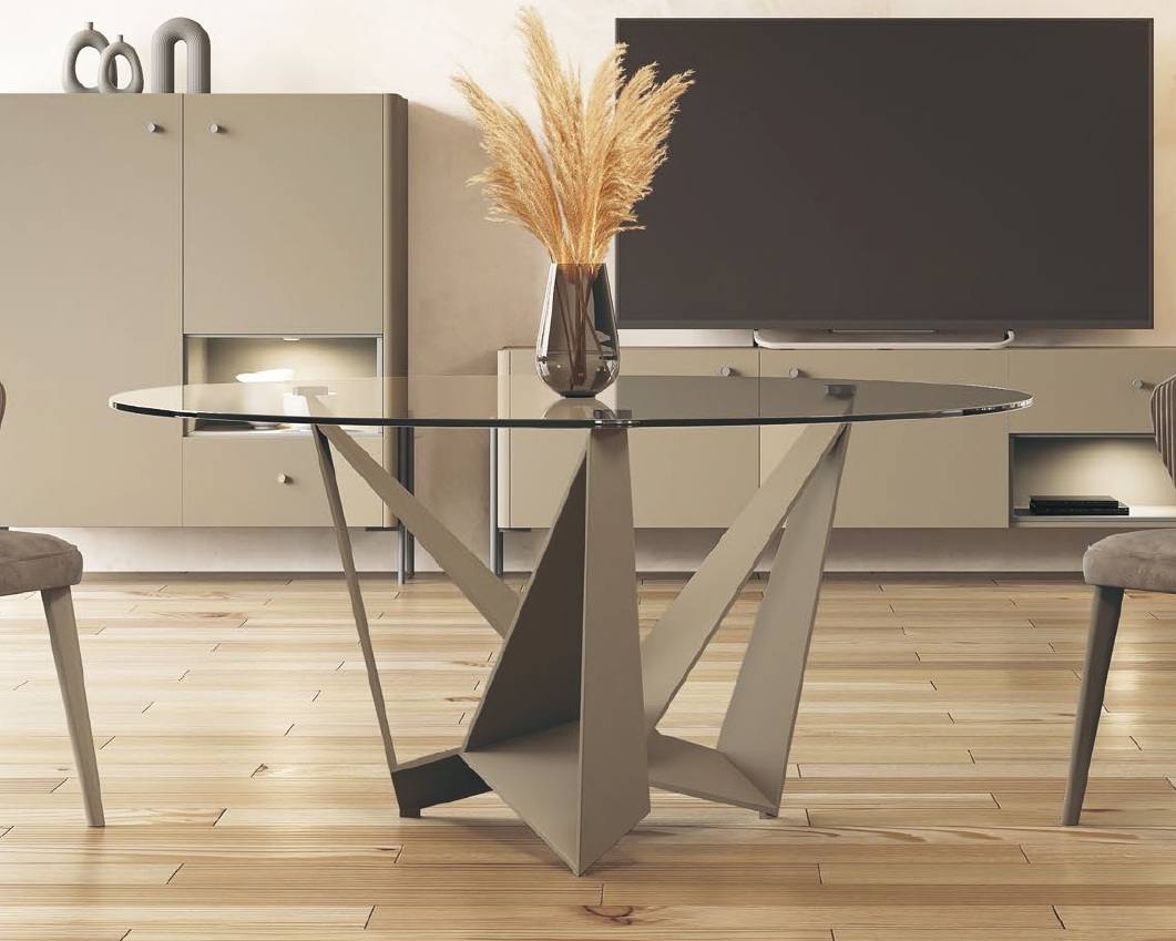 Mesa Araña com tampo redondo em vidro temperado e pé metálico.