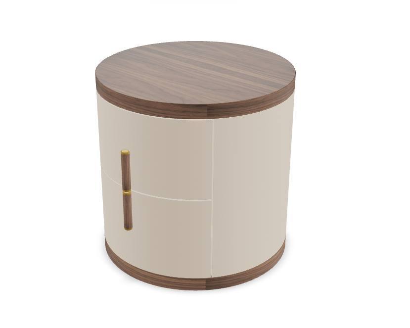 Mesa Cabeceira 7219 com estrutura de madeira folheada em nogueira natural estofada em poliuretano na cor vison e uma base original de madeira folheada na cor nogueira.