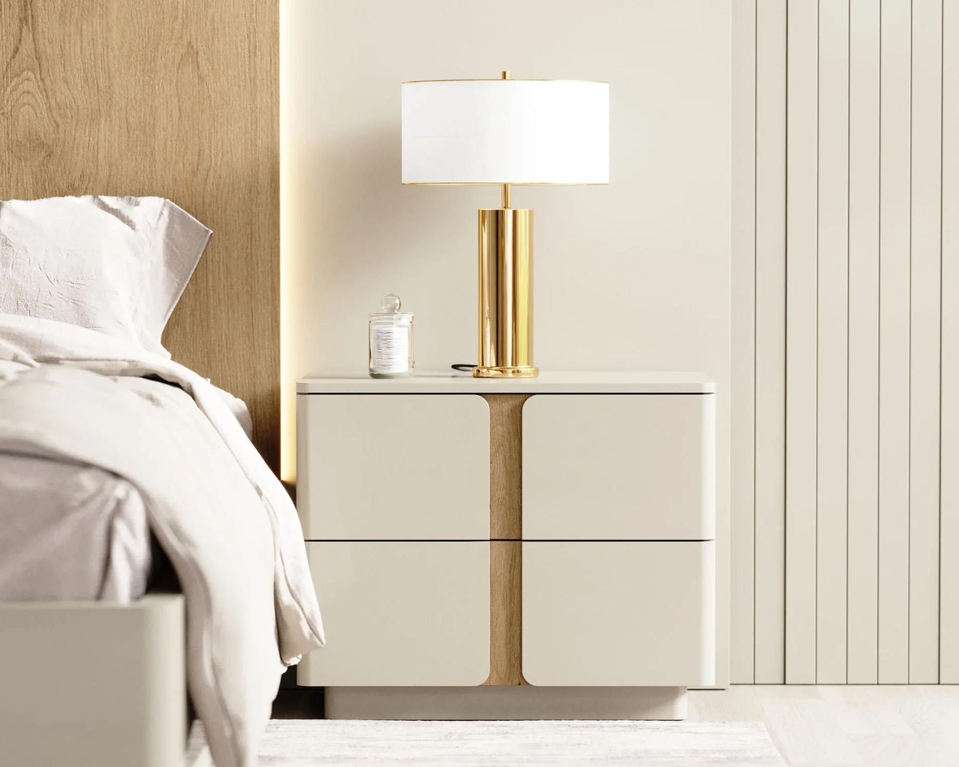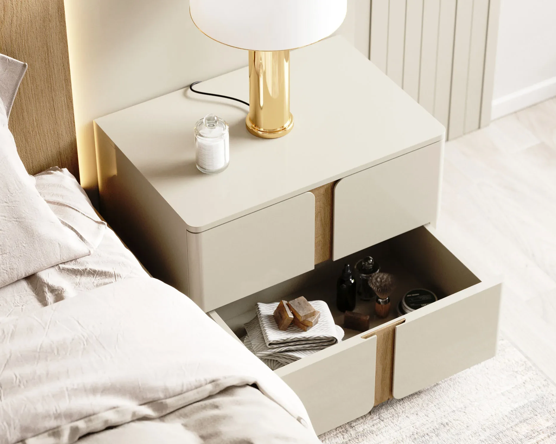 Mesa Cabeceira Soho com três gavetas em Lacado e friso em carvalho.