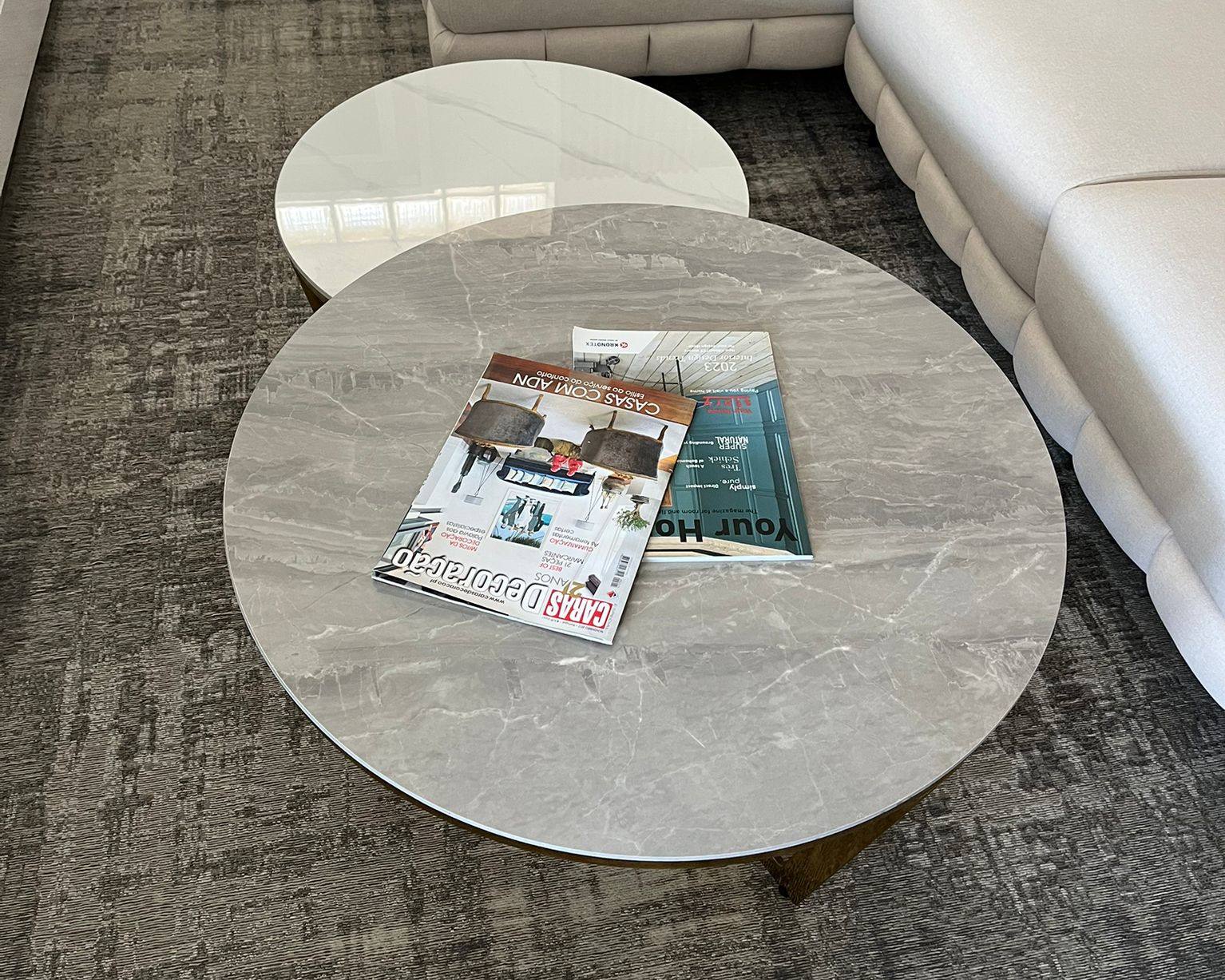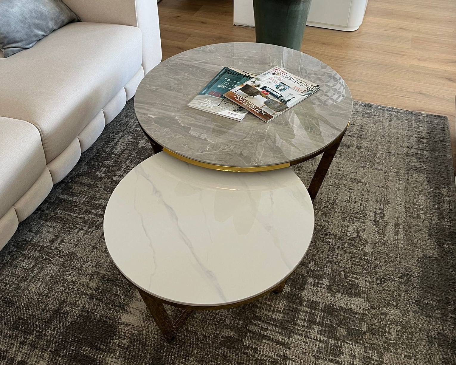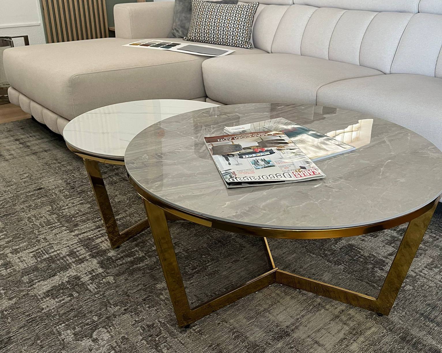 Conjunto de mesas de centro 888CT245 com tampo redondo em mármore e pés em Dourado.