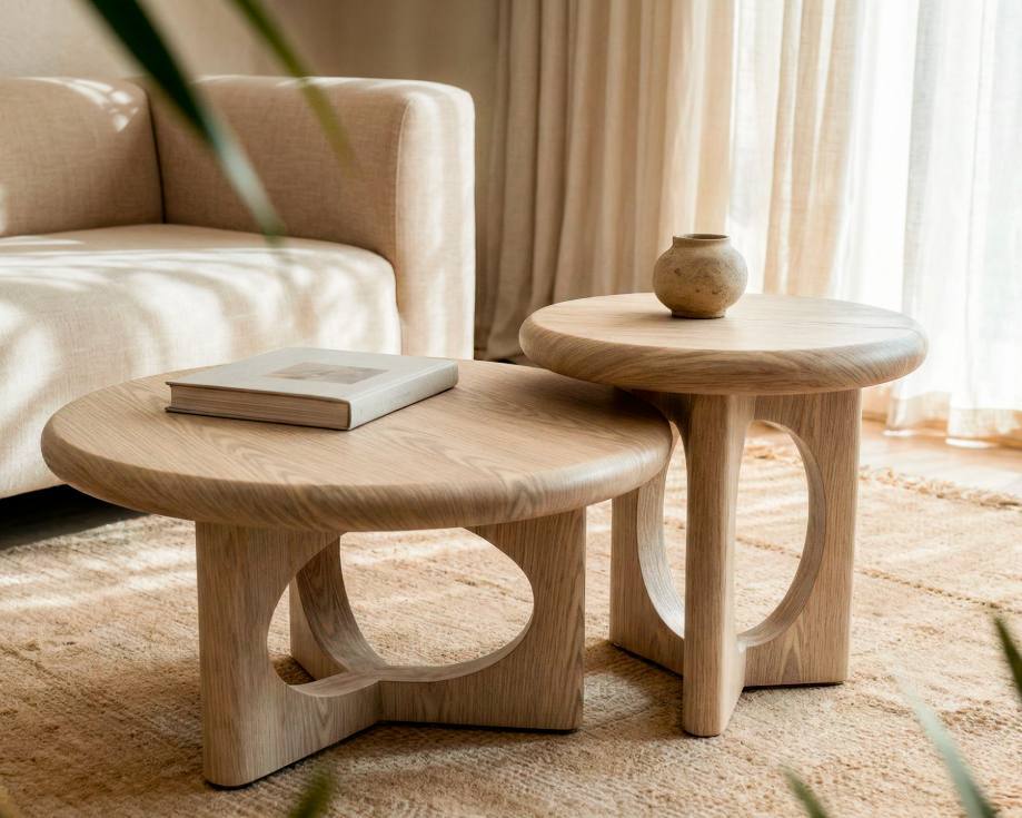 Mesa Centro Arnaud em madeira folheada com acabamento em carvalho, realça os veios naturais do material e acrescenta aconchego ao ambiente, sendo ideal para salas de estar contemporâneas ou espaços com inspiração natural.