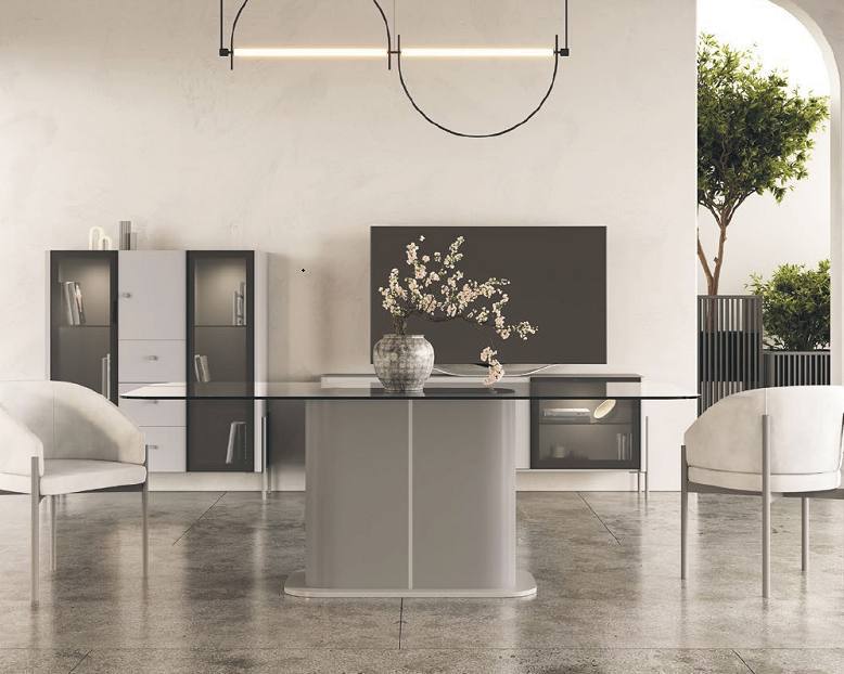 Mesa Nala com tampo retangular em vidro temperado.