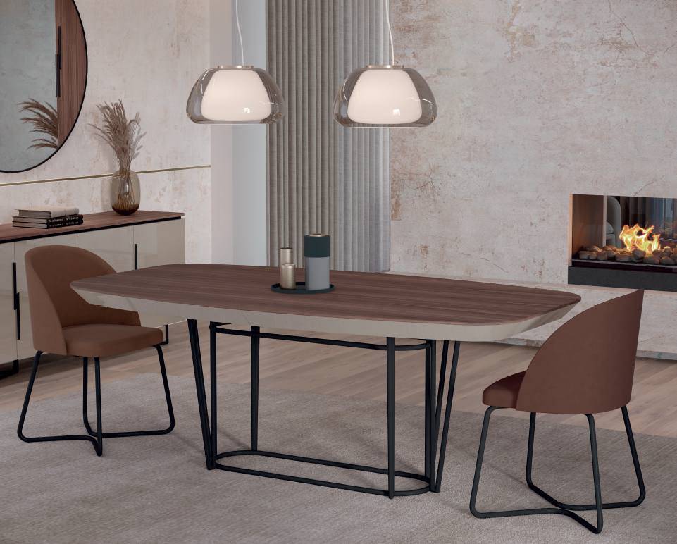 Mesa Nory com tampo em madeira extensível e pés metálicos.