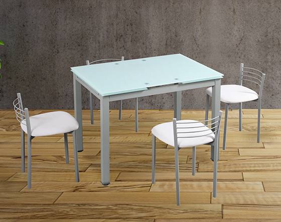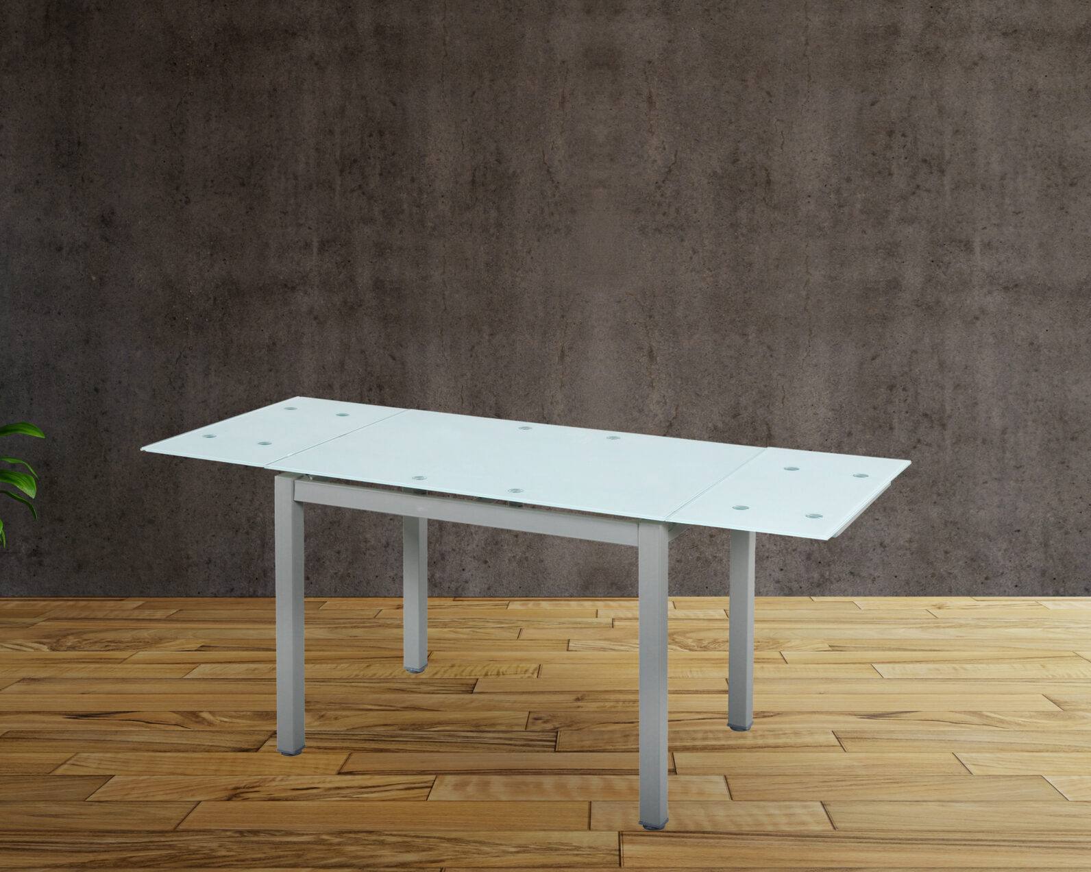 Mesa cozinha retangular com tampo de vidro extensível.