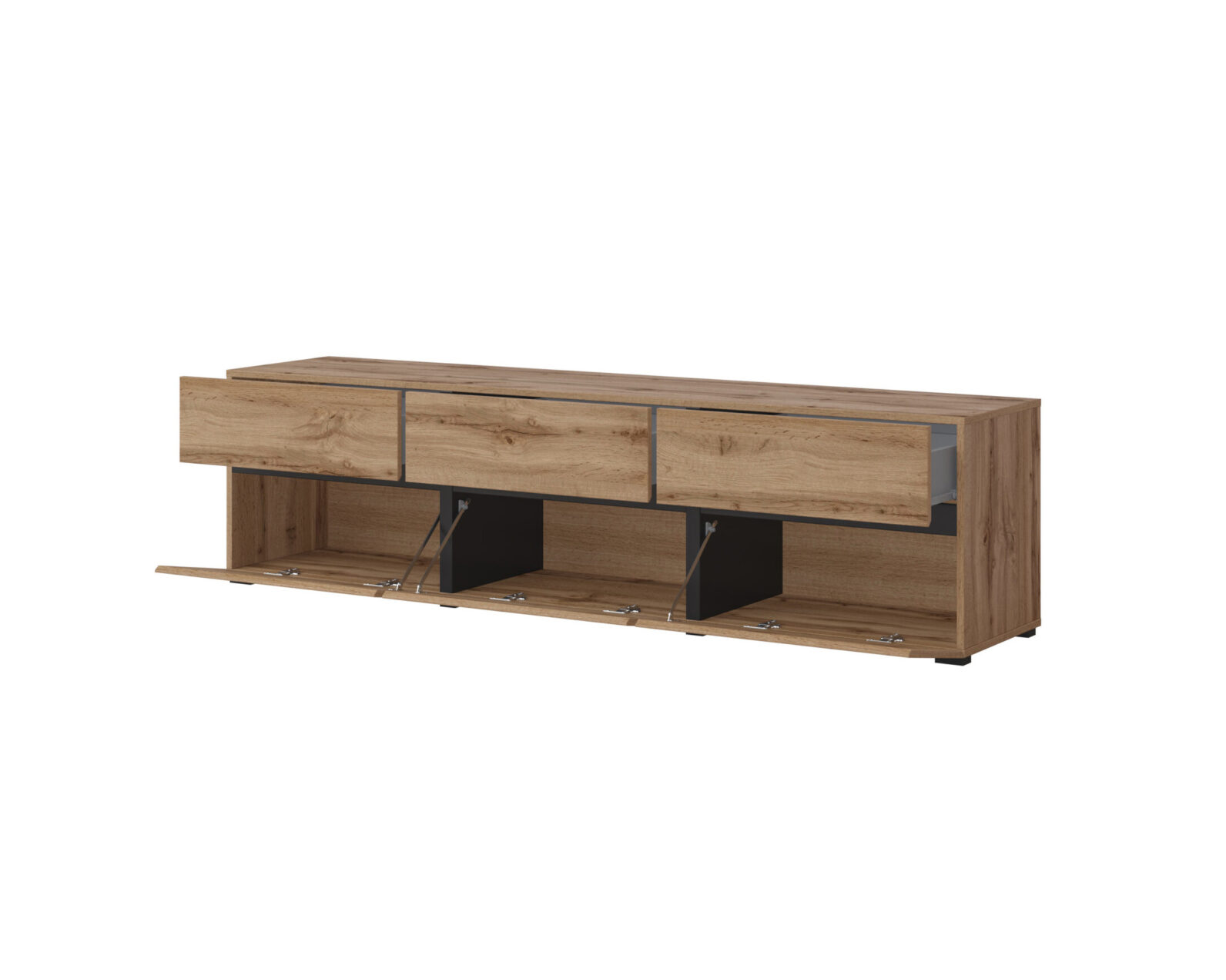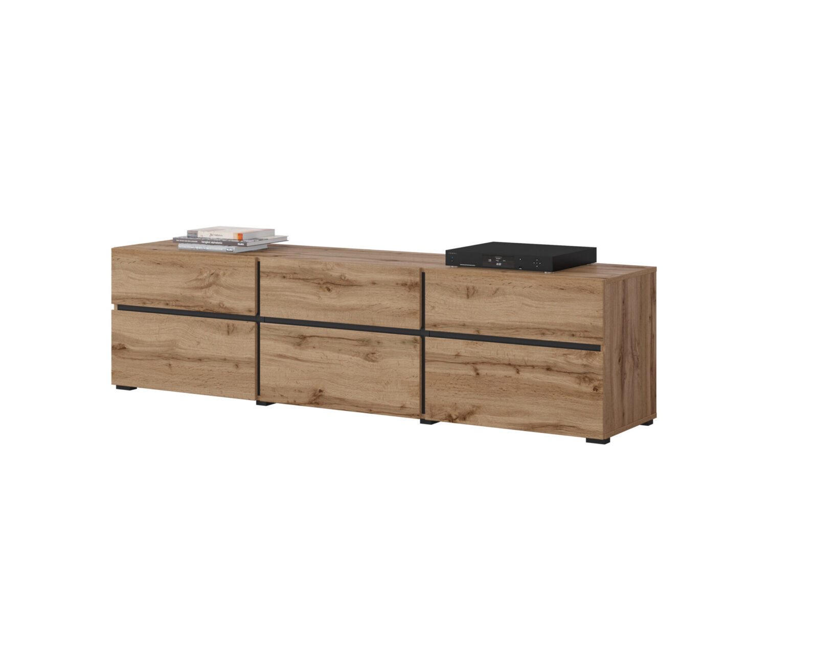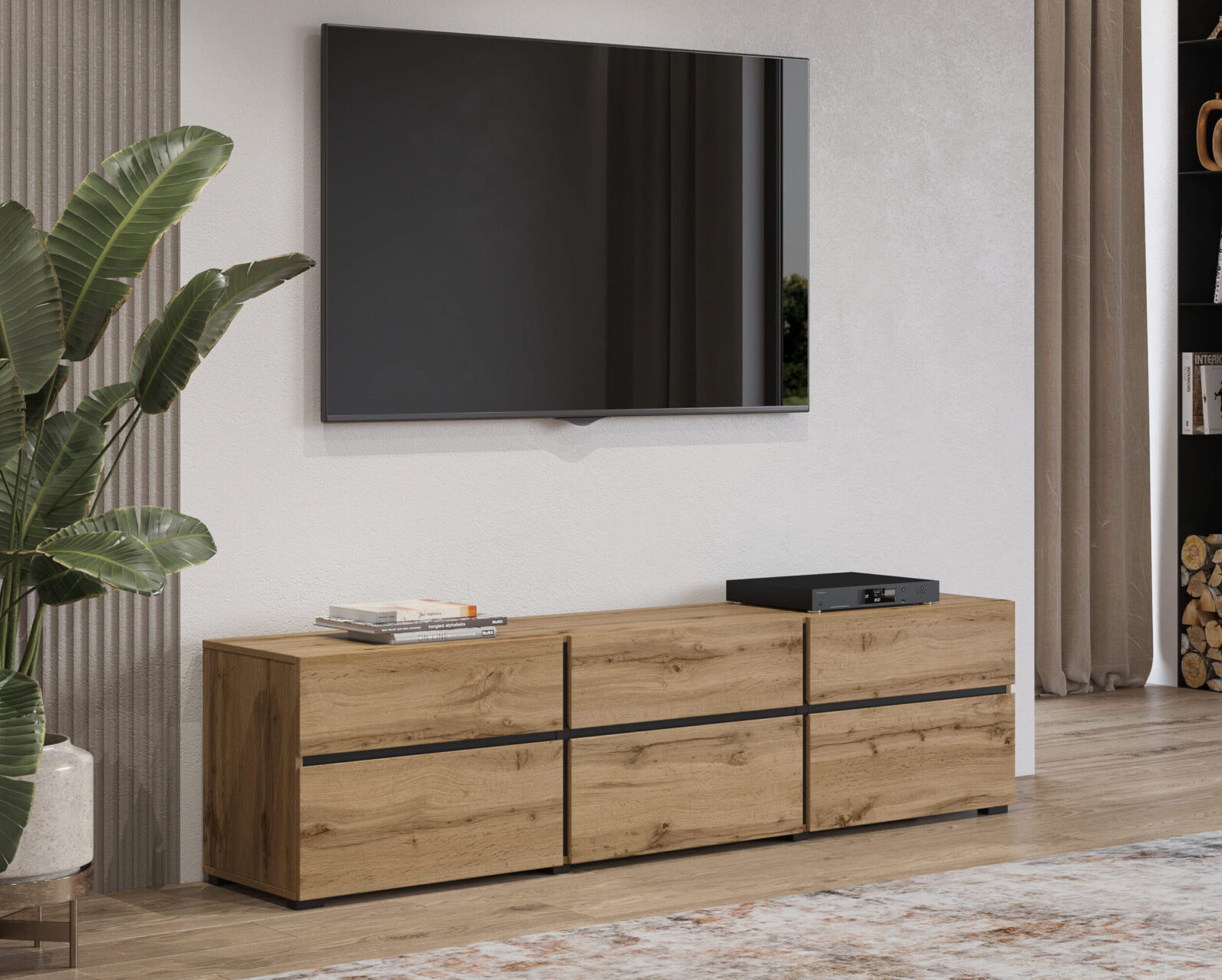 Móvel Tv Cross em Laminado com três portas rebatíveis e três gavetas.