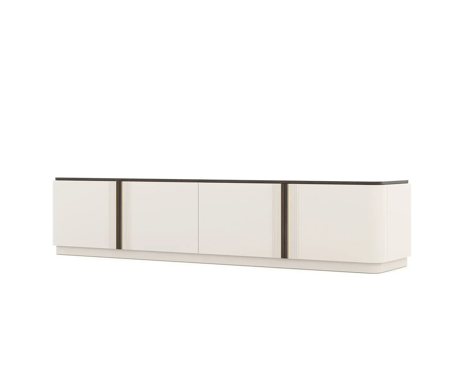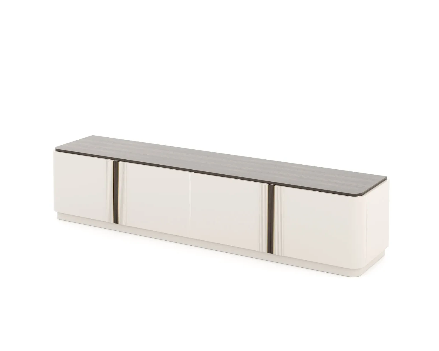 O Móvel de TV Daris é revestido em lacado branco, proporcionando um acabamento suave e elegante, que se vai adaptar a diversos estilos de decoração. Com 4 portas, cada uma equipada com uma prateleira interna, vai ter todo o espaço necessário para organizar e guardar os seus dispositivos eletrónicos, comandos e outros relacionados. Um detalhe notável aparece no encontro das portas, onde uma combinação de eucalipto e dourado adiciona um toque de sofisticação e beleza à peça.