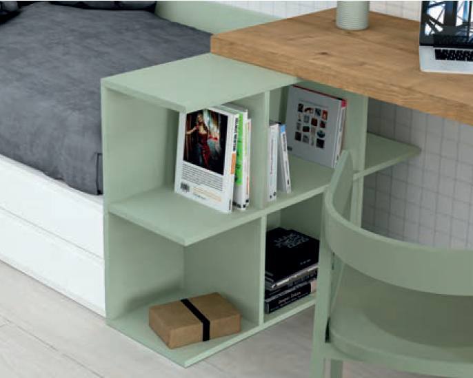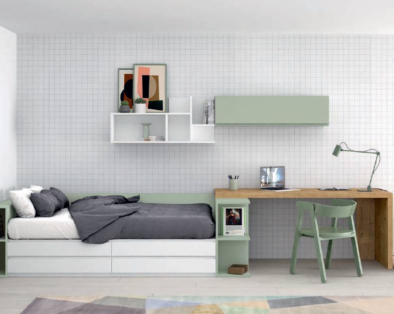 Quarto Individual Stay Yong 16 Antaix – Um design linear que incorpora novos elementos abertos, como a mesa de apoio/aparador Complet e a prateleira baixa Mic. O tampo robusto com 5 cm de espessura e o suporte conferem elegância ao conjunto.