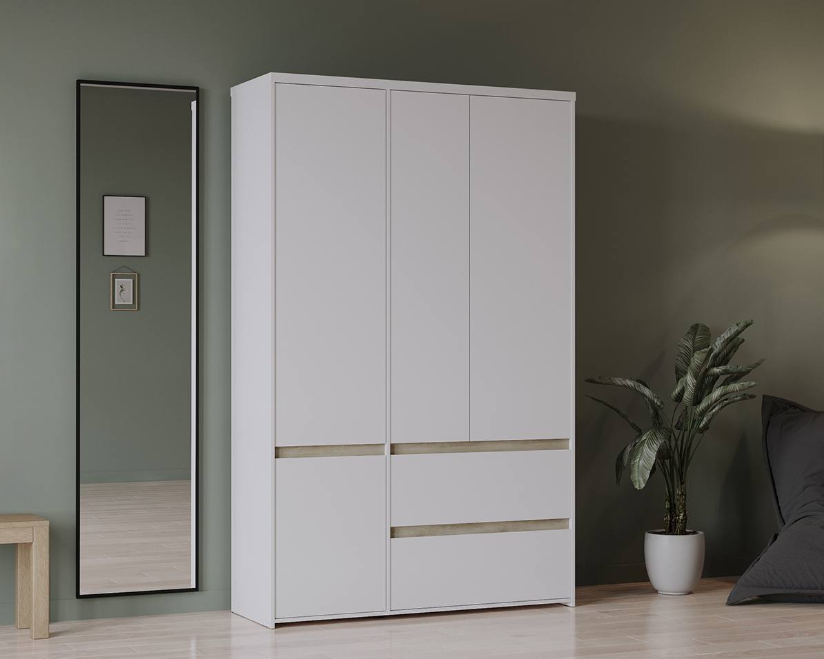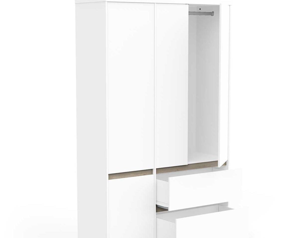 Roupeiro Clyde com quatro portas e duas gavetas.