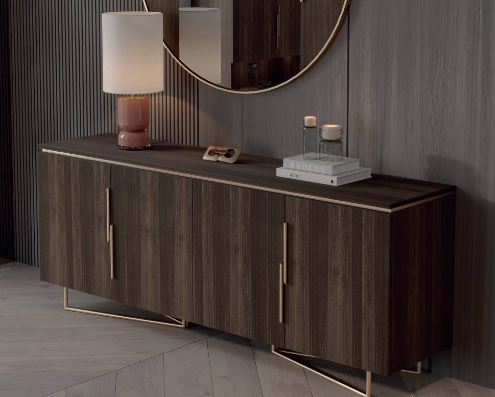 1x Aparador Nory com quatro portas em folha de madeira e pés metálicos.