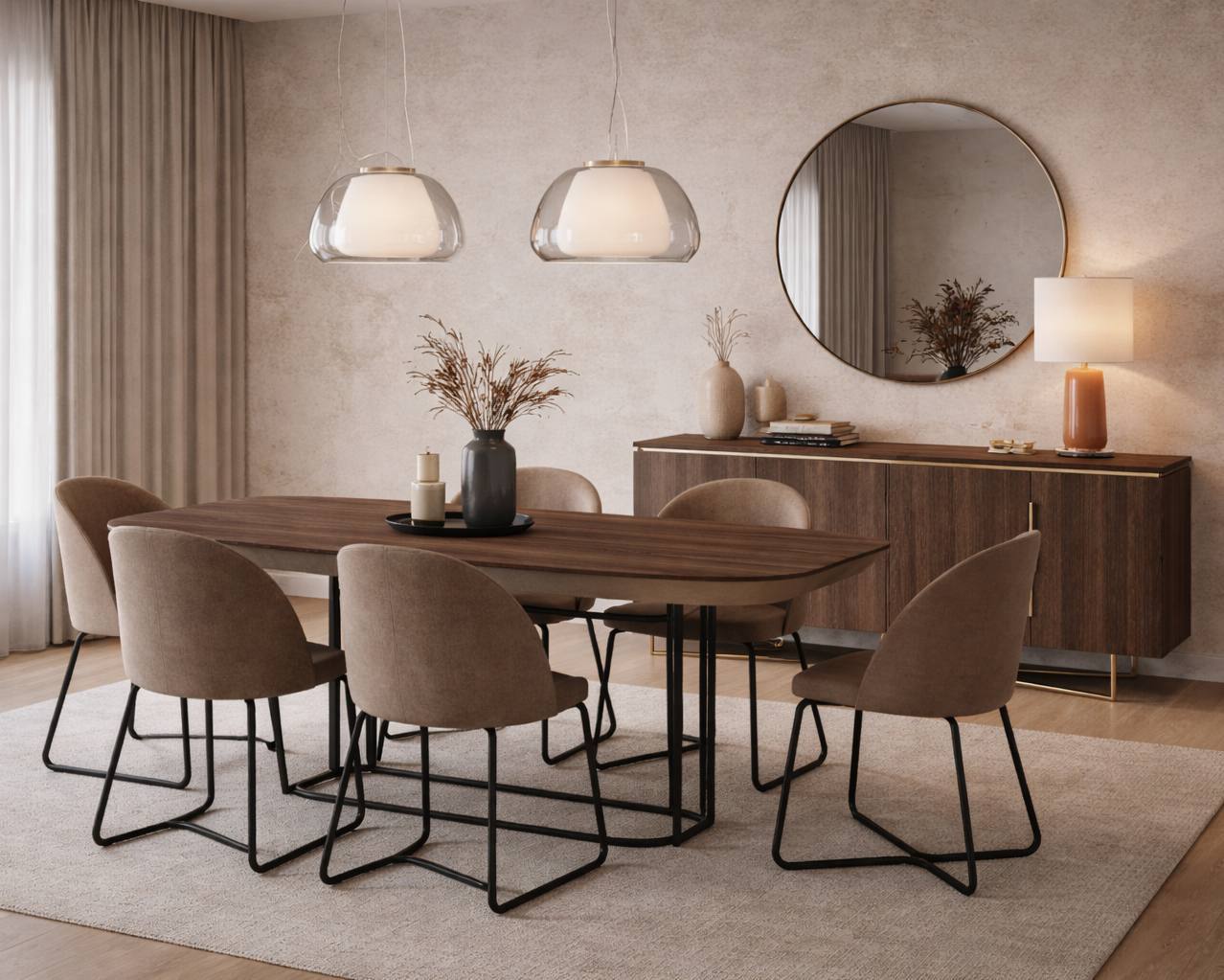 Sala de jantar Nory em madeira com pormenores em Lacado Mate e pés metálicos.
