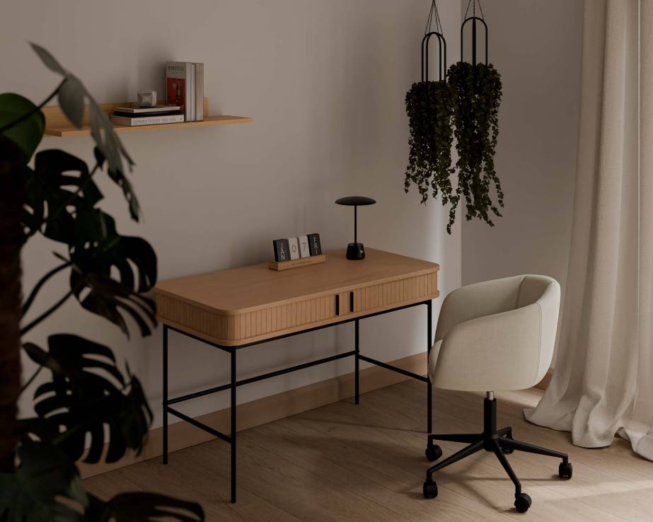 Com uma estrutura robusta em carvalho natural e pés em metal preto mate, esta secretária destaca-se pelo equilíbrio entre solidez e modernidade.