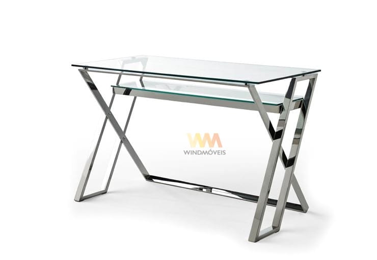 Secretaria DK905 com tampo de vidro e pés em Inox;
