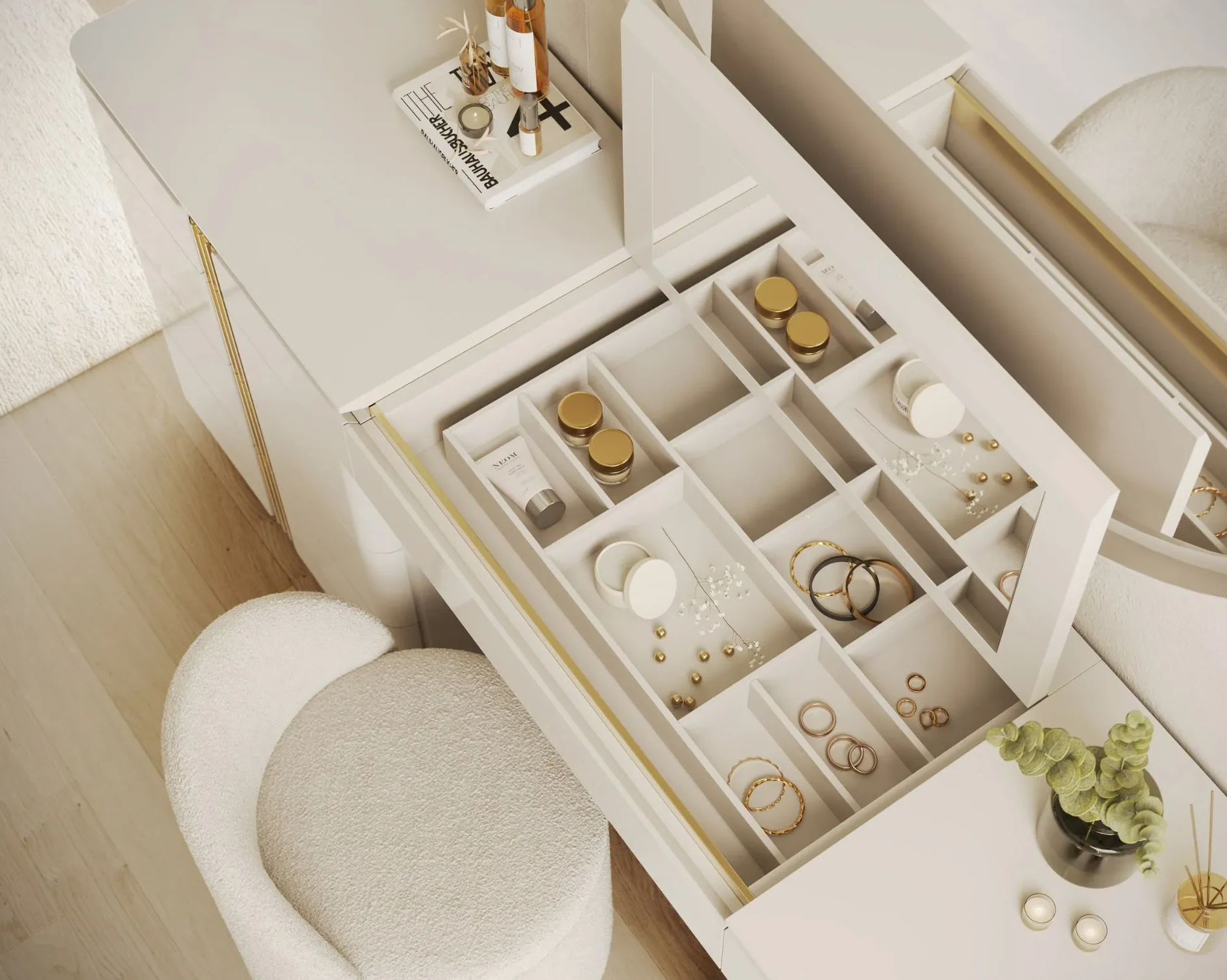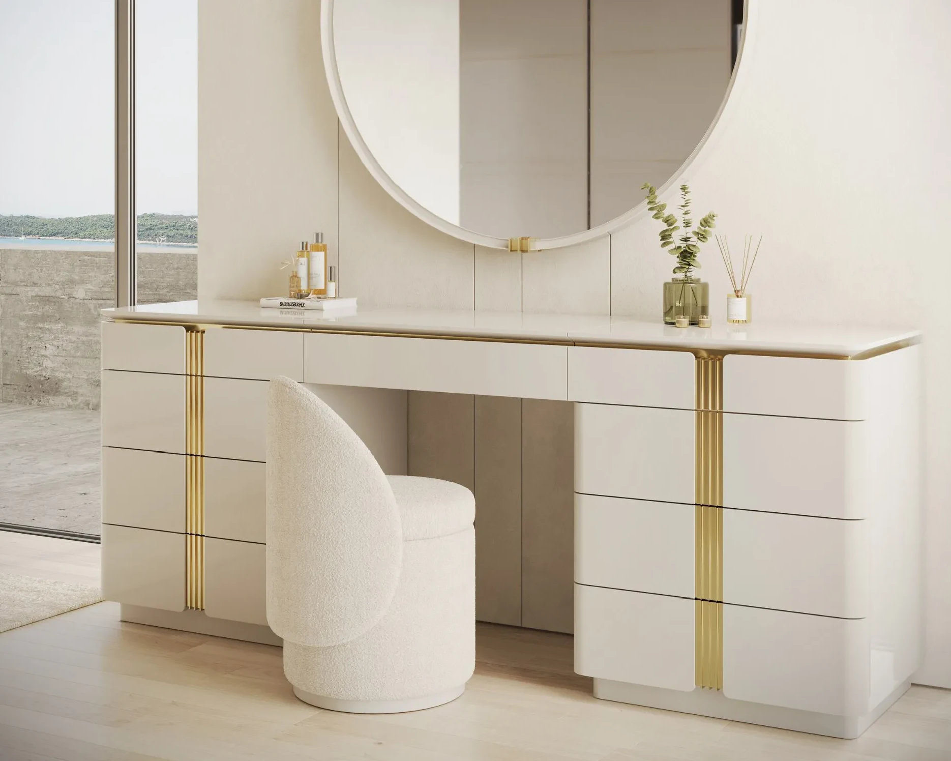Secretaria / Tocador Noah com oito gavetas em Lacado com pormenores em dourado.