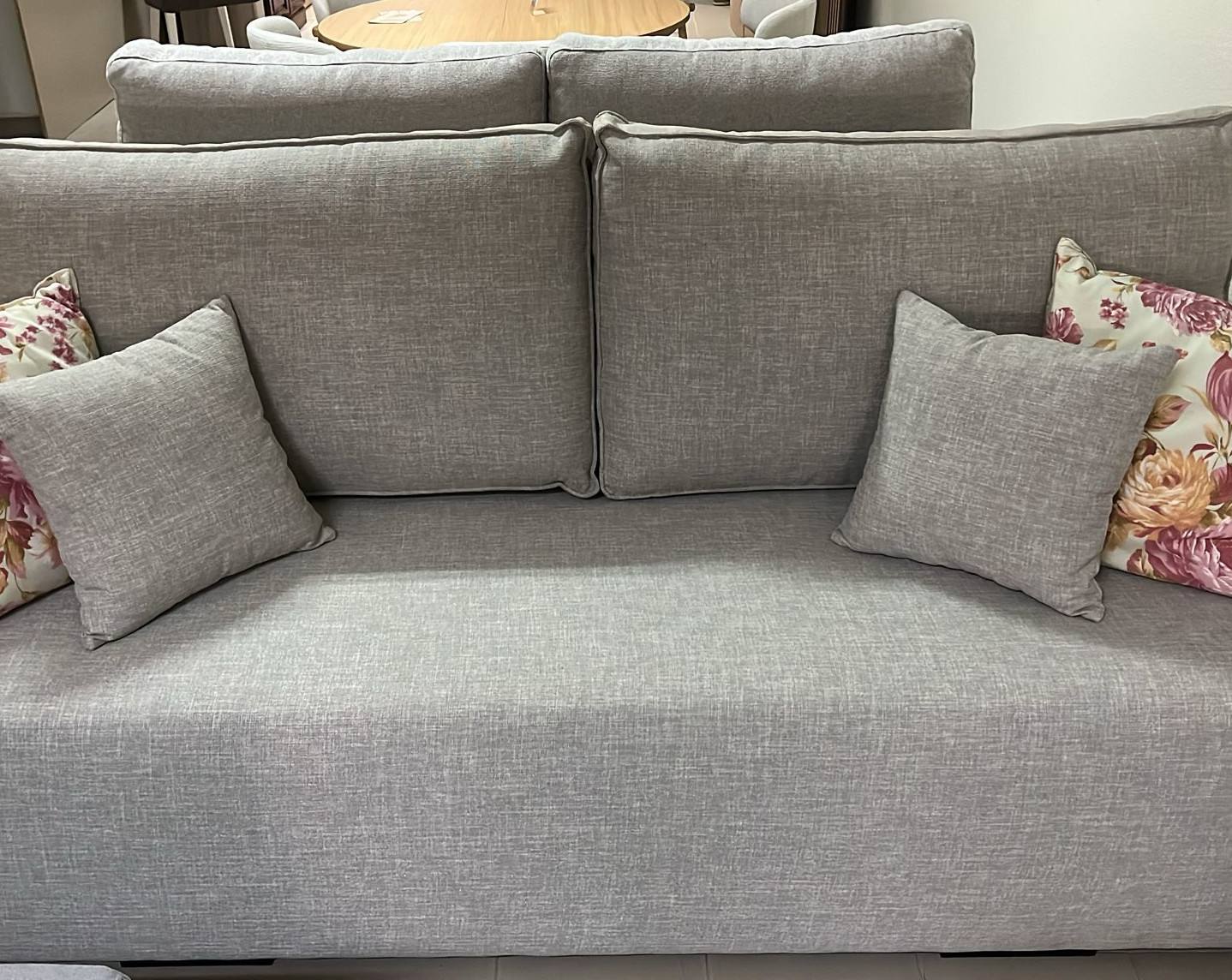 Sofa cama Bobo com revestimento em tecido Cinza, estruturas em madeira de pinho maciço.