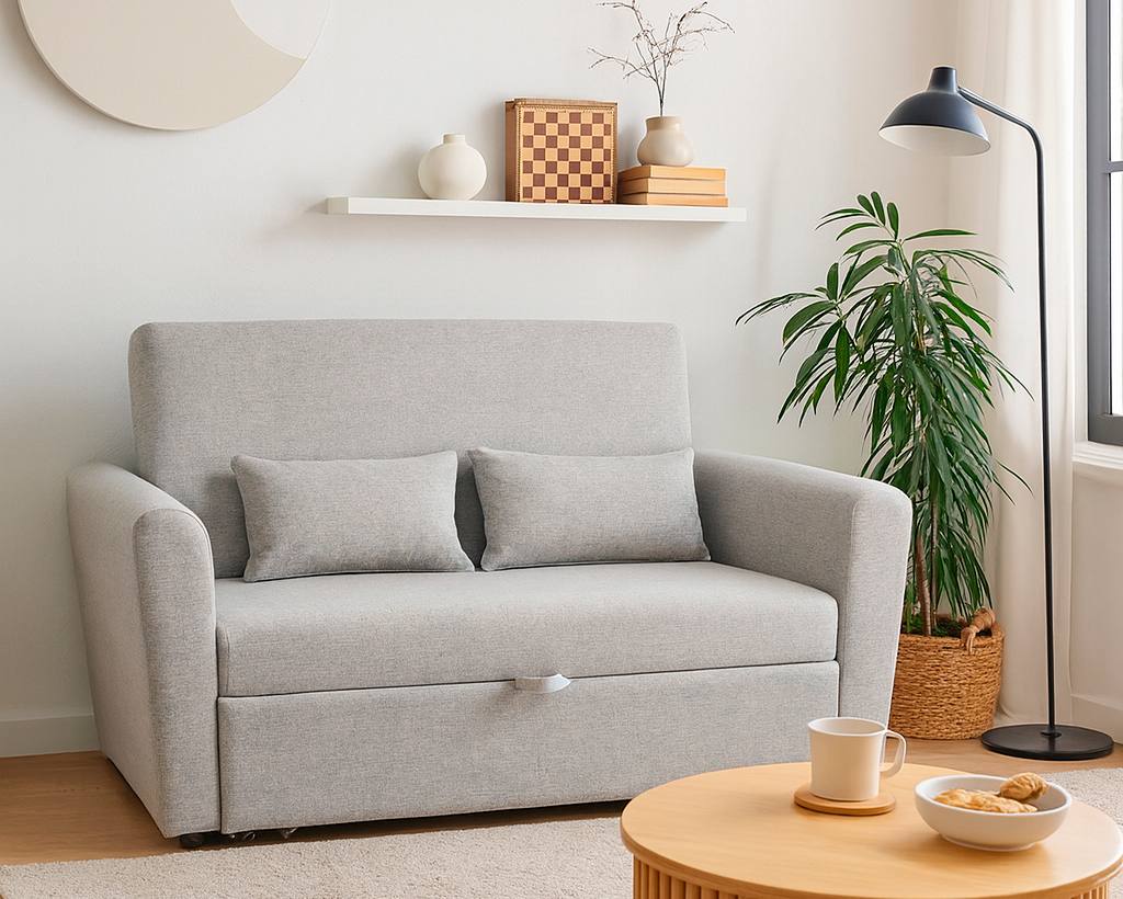 Sofa cama Ciro com estrutura em madeira e revestimento em tecido.