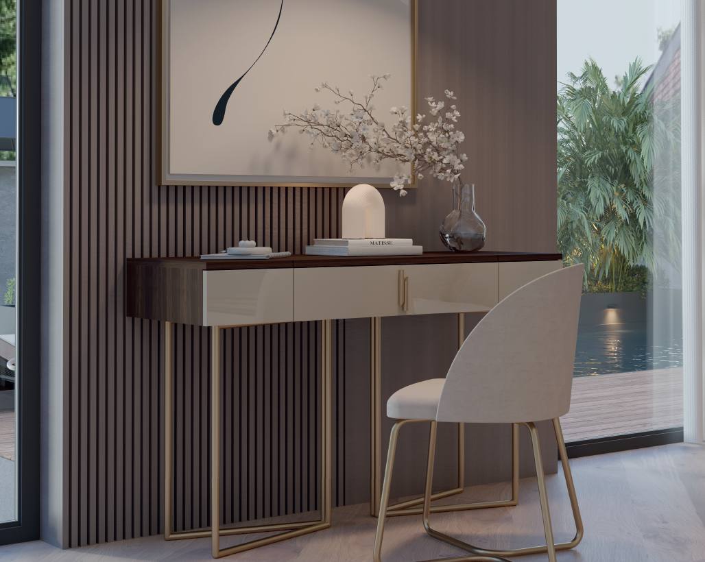 Tocador Nory com estrutura em Nogueira e frentes em Lacado Mate com pés metálicos em Dourado.