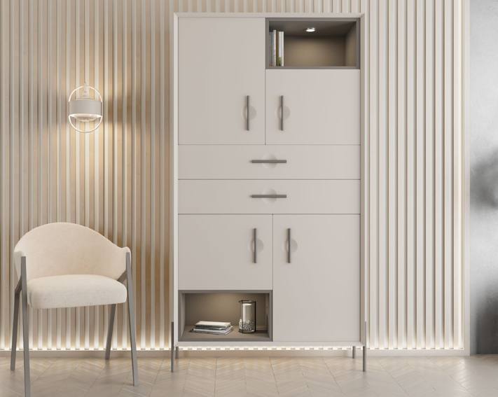 Vitrine Klassic com quatro portas e duas gavetas em Lacado Mate com pés em alumínio.