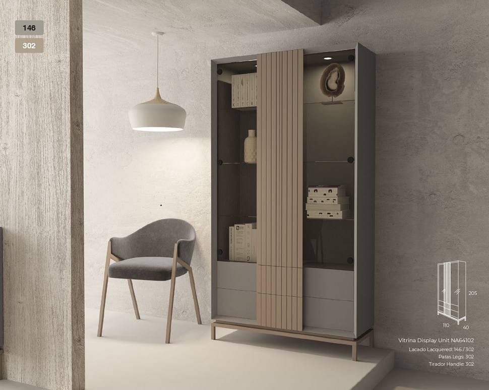 Vitrine Natura com duas portas e duas gavetas em Lacado Mate com pés metálicos.